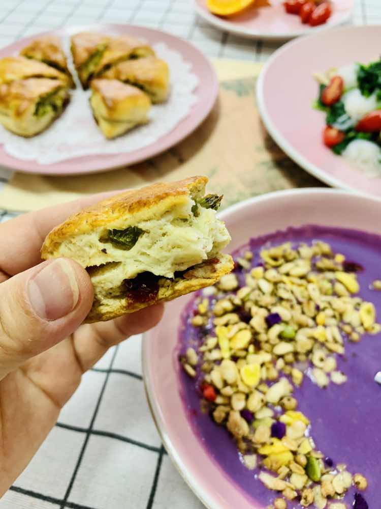 早 轻松时别忘了努力 忙碌时别忘了梦想 早餐:全麦蔓越莓司康 果蔬沙拉 紫薯谷物麦片