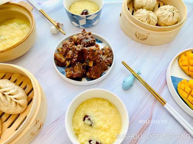 周末早安 人生不过如此,保持乐观积极地情绪,迎着阳光一路向前! 早午餐: 红烧排骨 韭菜豆腐丁素馅包子 红枣小米粥