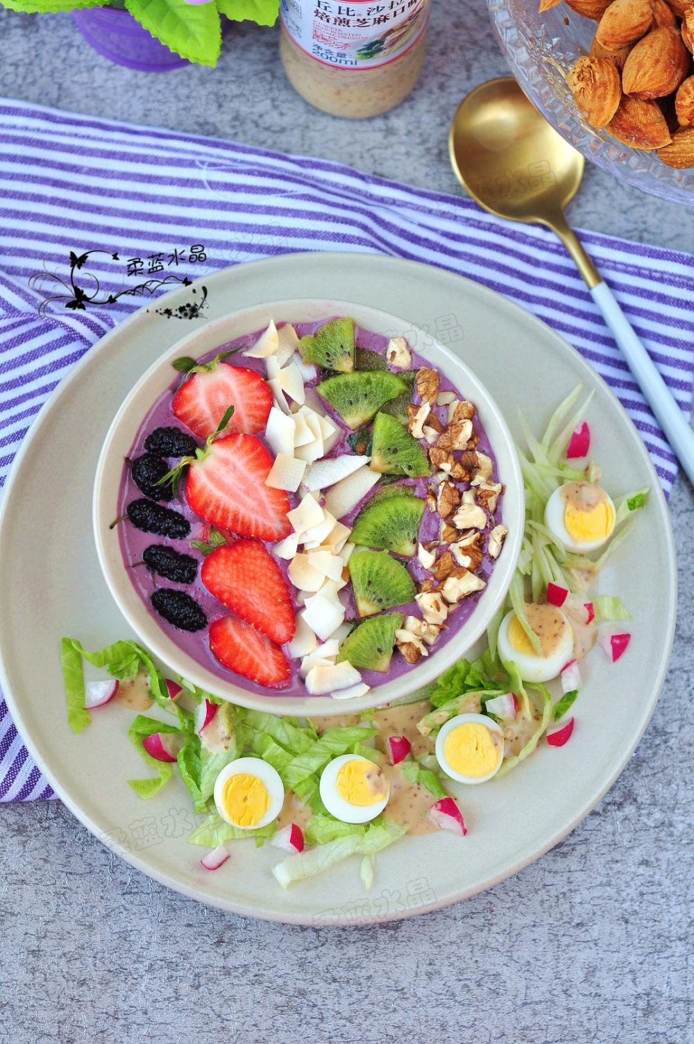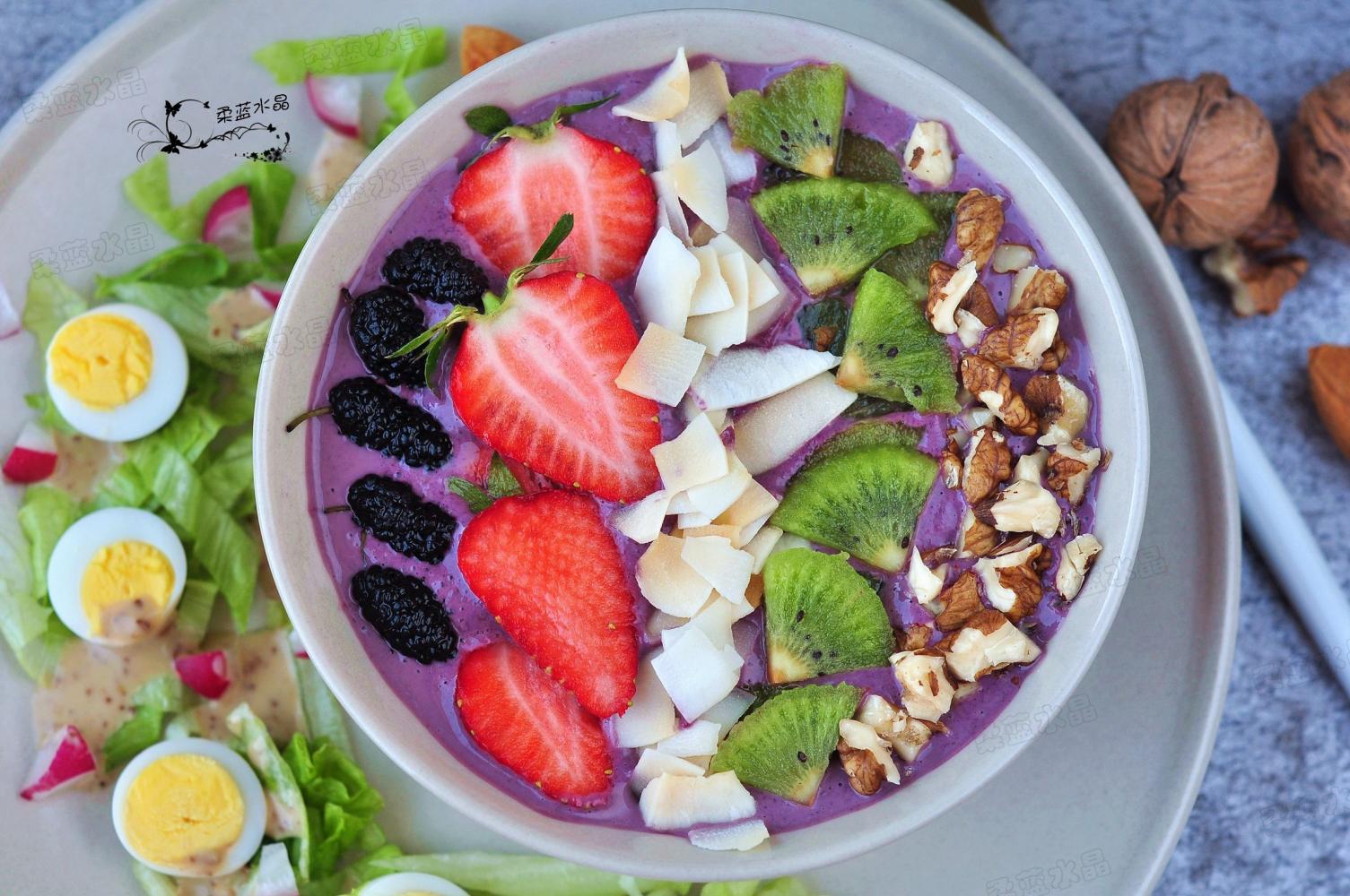 桑葚具有很高的营养价值和药用价值,含糖、蛋白质、脂肪、糅酸、苹果酸及维生素A、维生素B1、维生素B2、维生素C、铁、钠、钙、镁、磷、钾、胡萝卜素和花青素。营养是苹果的5—6倍,是葡萄的4倍,具有多种功效。被认为是“二十一世纪最佳果品”。洗净后直接吃,是桑葚最原始的吃法,但是如何搭配,让营养与美味更上一层楼呢?那就请做做思慕雪吧,加入了丰富的燕麦、水果、坚果,特别适合做早餐,热量也不高,还美得让人下不了口。