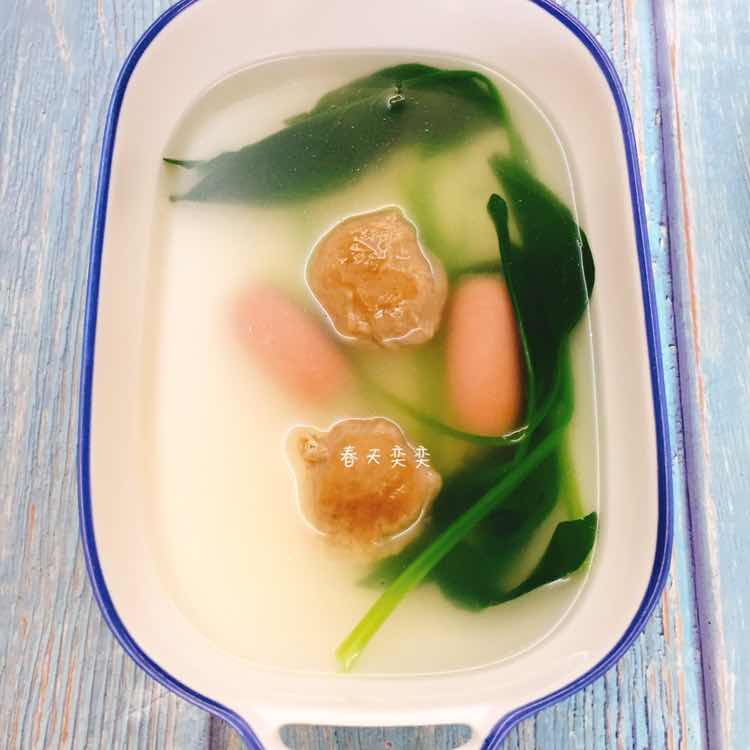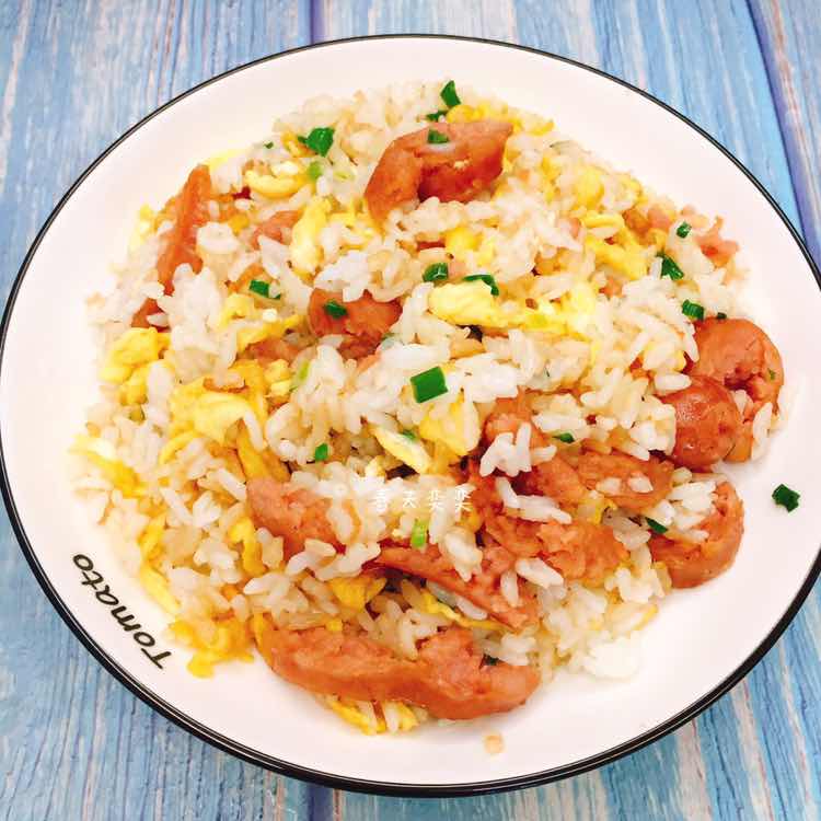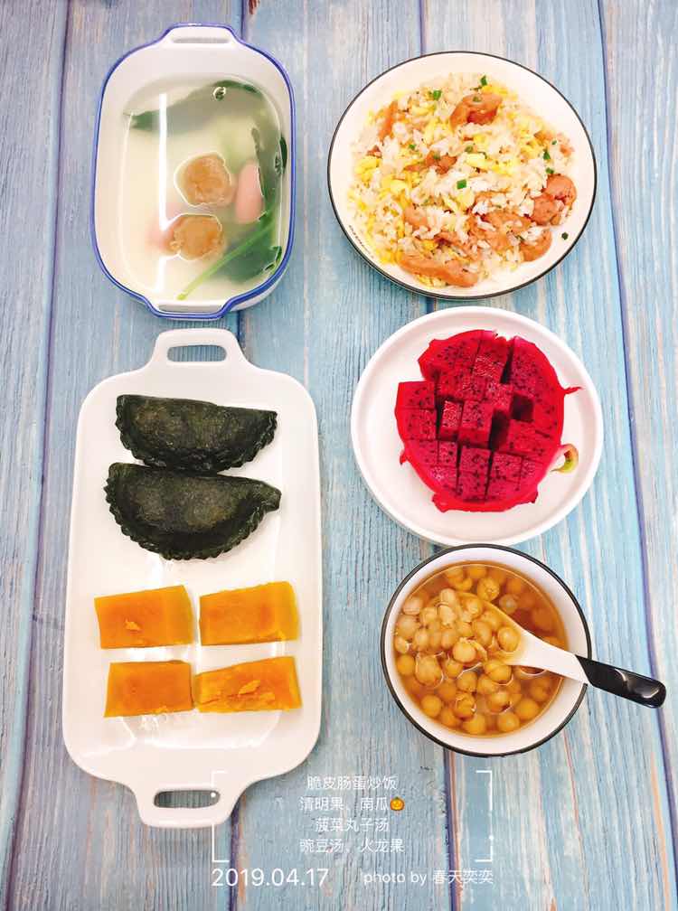 早安[玫瑰] 今日早餐 脆皮肠蛋炒饭、清明果、南瓜、菠菜丸子汤、豌豆汤、火龙果