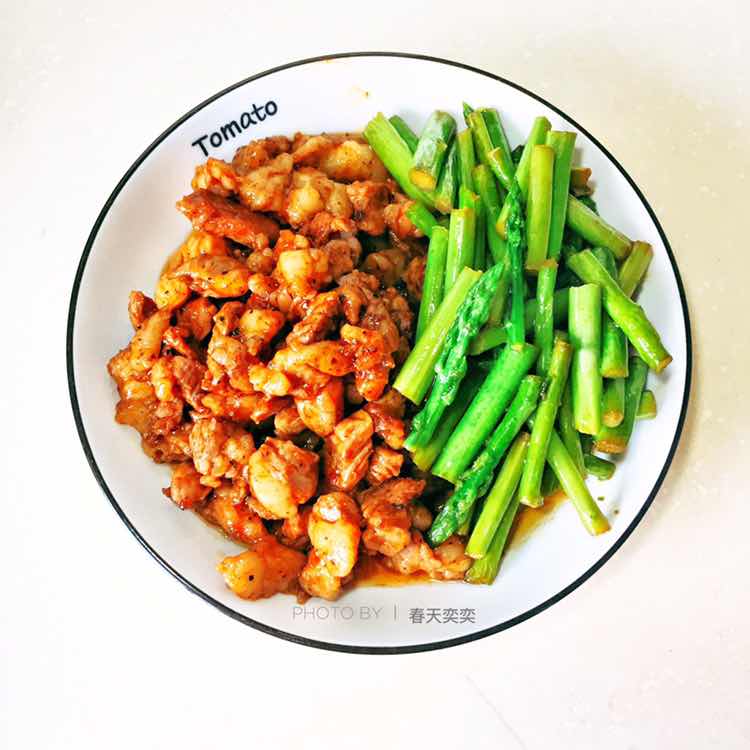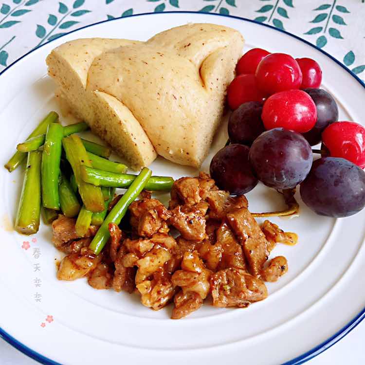 早安 今日早餐 红糖粥馒头、炒牛肉丁、清炒芦笋、杂粮粥、樱桃、葡萄