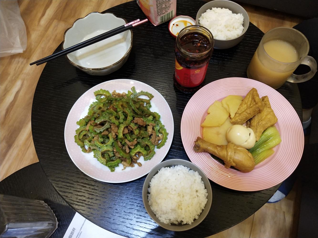卤水+苦瓜炒肉+老干妈+桃汁