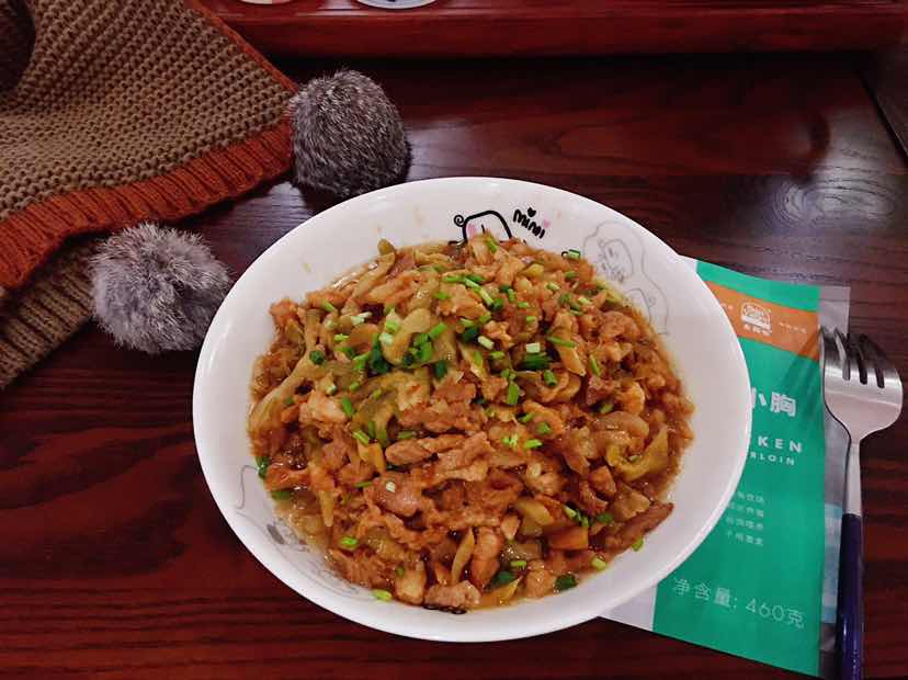 今天晚餐 太阳谷鸡丝炒榨菜 太阳谷鸡胸肉加点肥瘦相间的猪肉和鸡胸肉混在一起,加入生抽和料酒搅拌均匀后加入适量淀粉拌匀后腌制一下,锅中放入适量油爆炒肉丝,后加入鱼泉榨菜混合搅拌均匀,盛盘后,可以开吃了,香香的味道,可以多吃一点饭饭哦!
