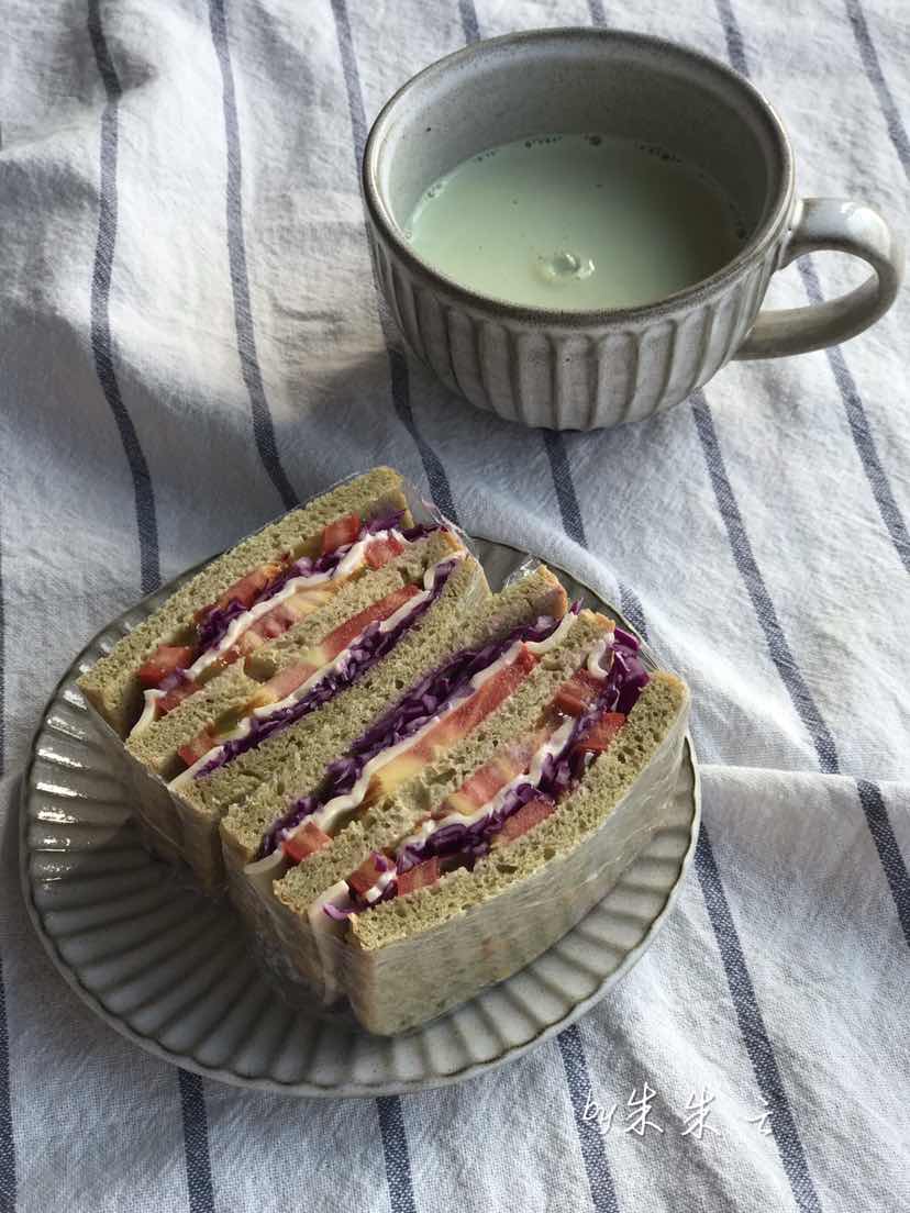 #早餐#20191010大麦若叶青汁牛奶+抹茶全麦吐司三明治。孩子生病喝小米粥,我的抹茶全麦吐司做出来颜色又是不美丽!但是抹茶的味道还是很好滴!做个健康吐司吧!