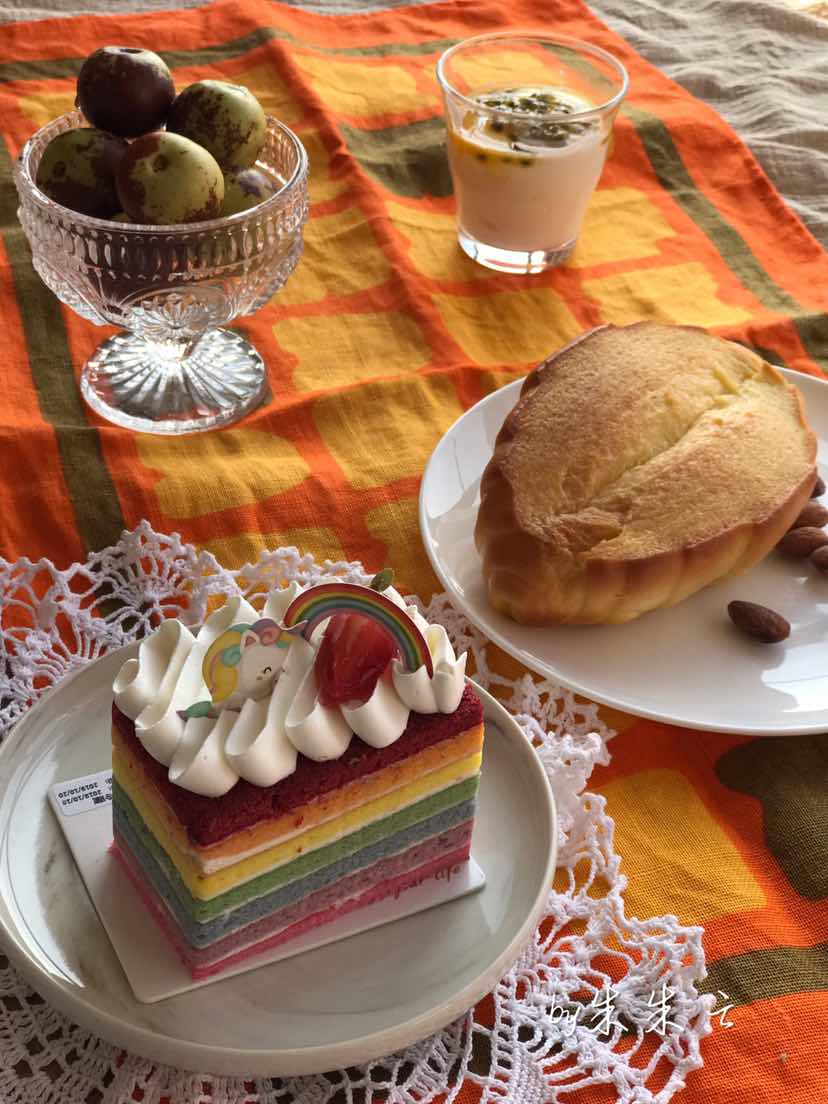 20191020自制酸奶百香果+罗宋包+杏仁+彩虹酸奶蛋糕+大枣。