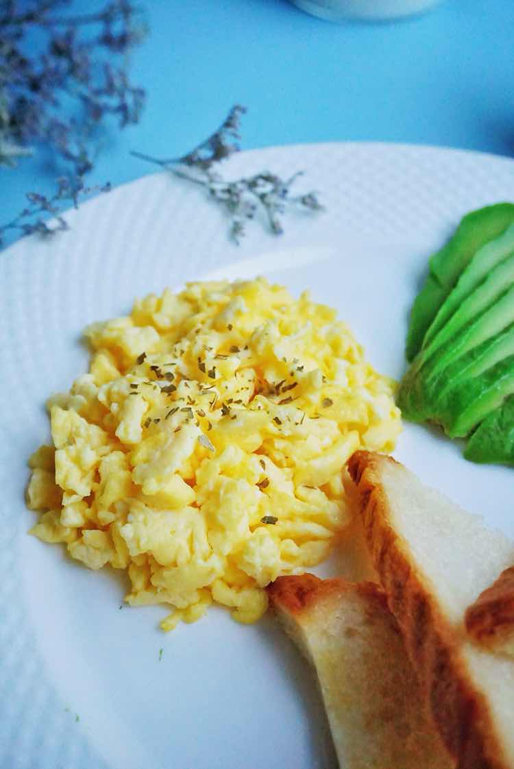 美式炒蛋、淡奶油吐司、牛油果,咖啡外加一小杯燕麦酸奶