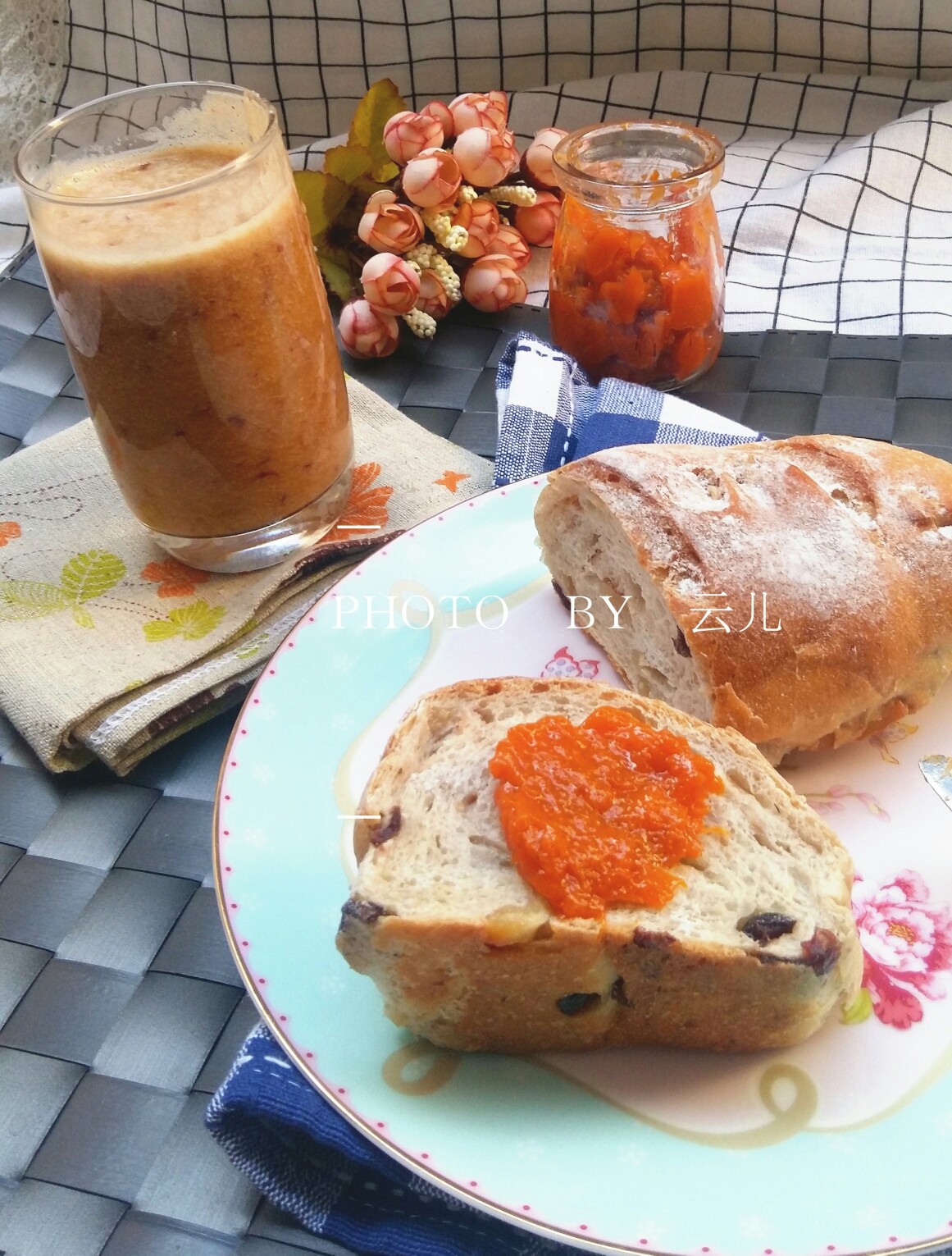 打一杯樱桃+青瓜+蟠桃的果汁,来一片自己做的蔓越莓核桃全麦面包,抹上自己熬的杏酱。很美味的早餐。