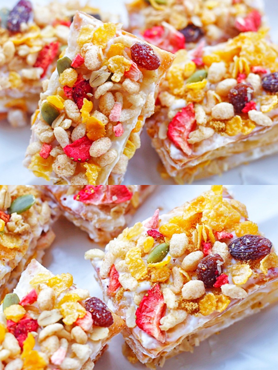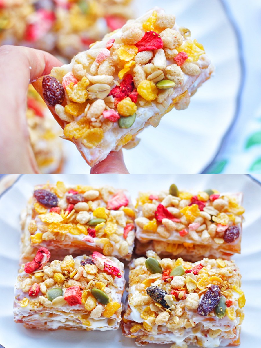 拿破仑酥,一张手抓饼就能轻松搞定!用酸奶代替了吃了容易胖的奶油,更加营养健康。酥到掉渣的层层酥皮,鲜香美味的肉松、细腻爽滑的酸奶与口感酥脆,营养丰富的草莓缤纷水果麦片相遇,绝对是妙不可言!一口吃到嘴里,甜进了心窝,嗯!棒呆了!