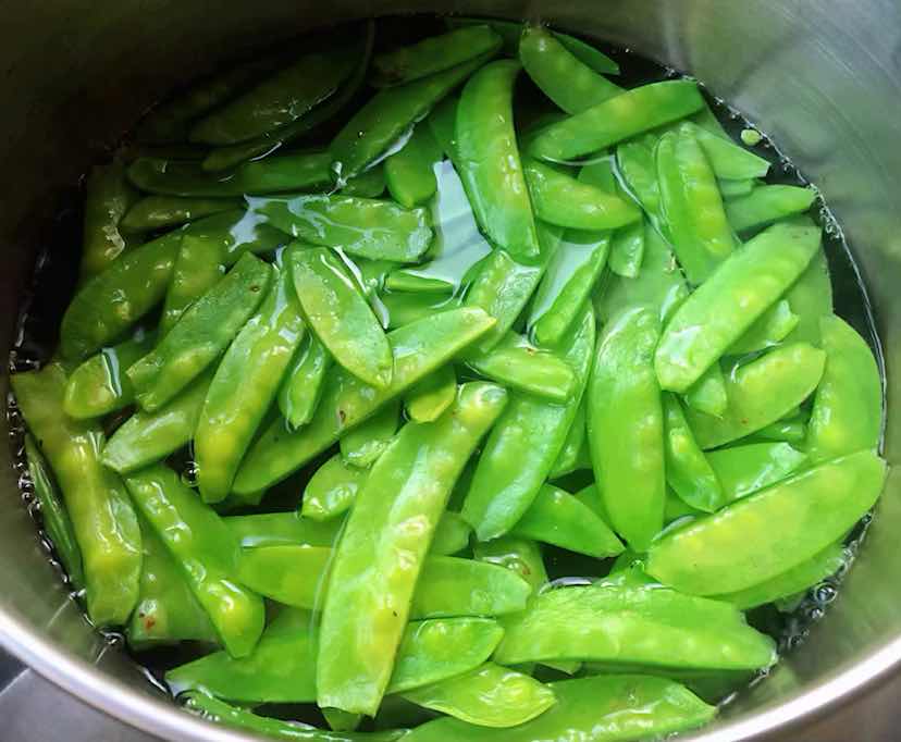 2锅中烧开水放入少许油和盐再放入荷兰豆焯水
