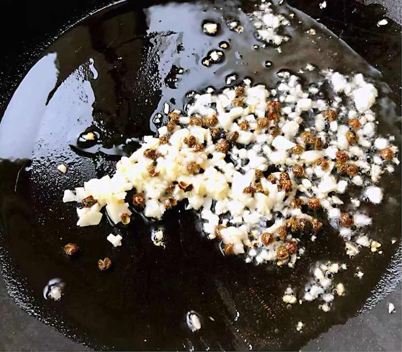 7锅中倒入底油加热放入麻椒炸香再放入蒜粒爆香