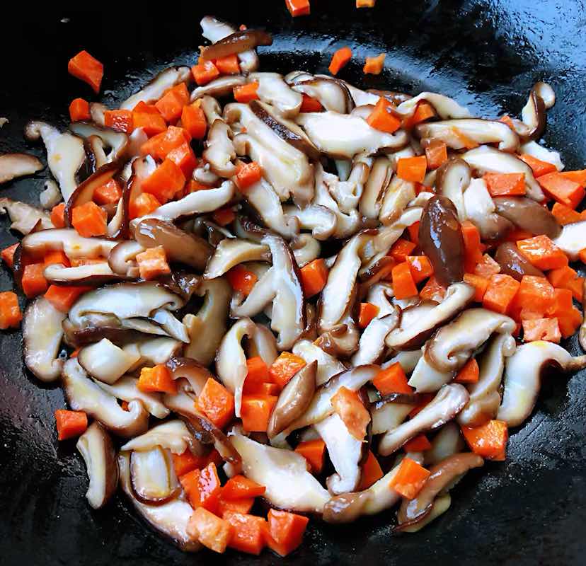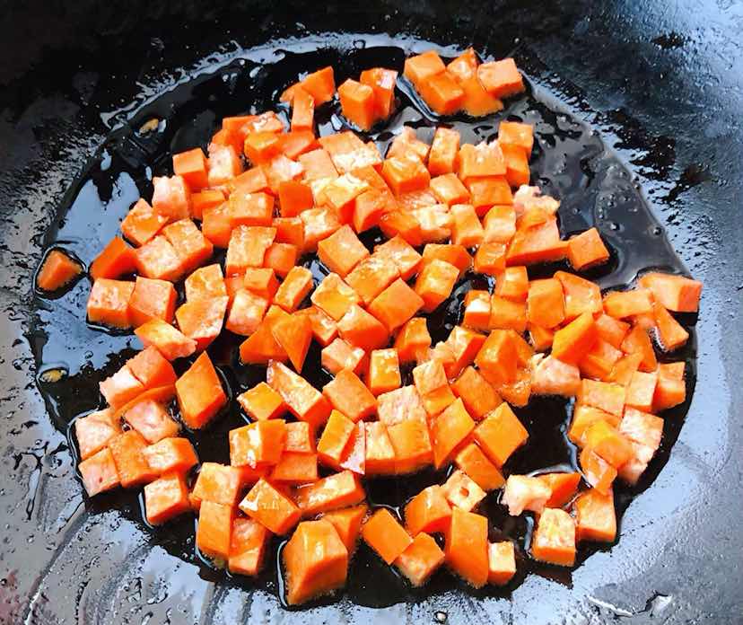 5锅中倒入底油放入切好的胡萝卜丁翻炒均匀