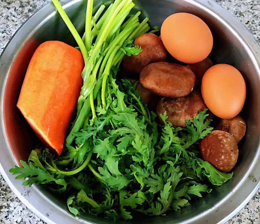 1准备原材料香菇、茼蒿、胡萝卜、鸡蛋备用