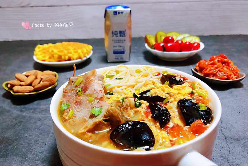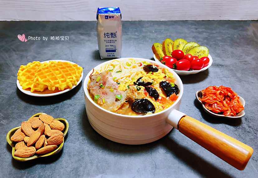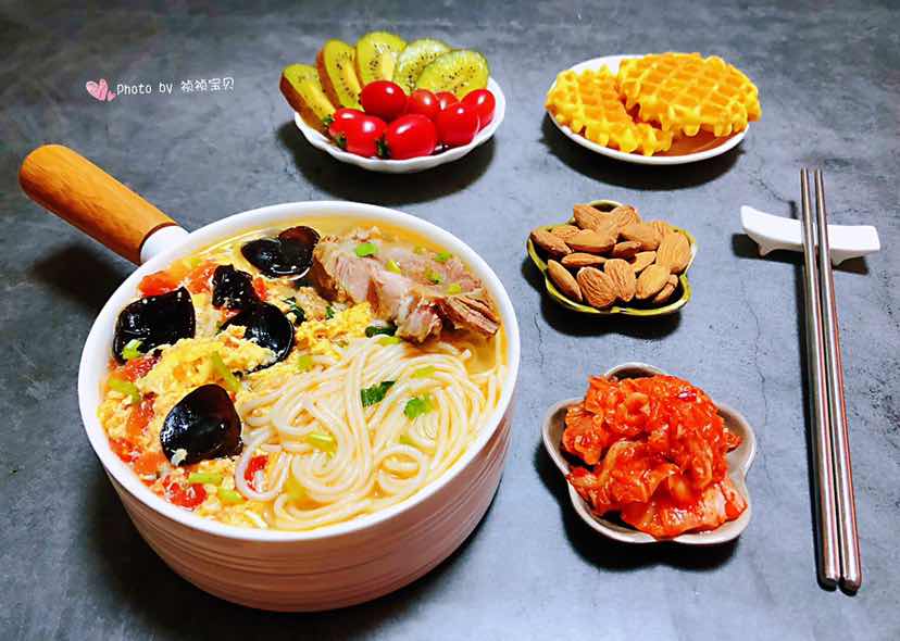 如要锻炼一个能做大事的人,必定要叫他吃苦受累,百不称心,才能养成坚忍的性格。 今日早餐:骨汤西红柿鸡蛋木耳打卤面+华夫饼+辣白菜+水果+坚果+酸奶