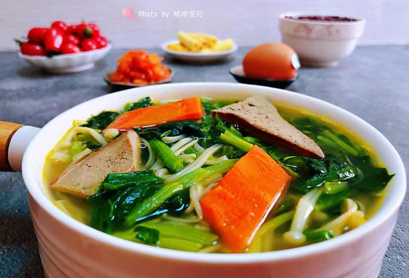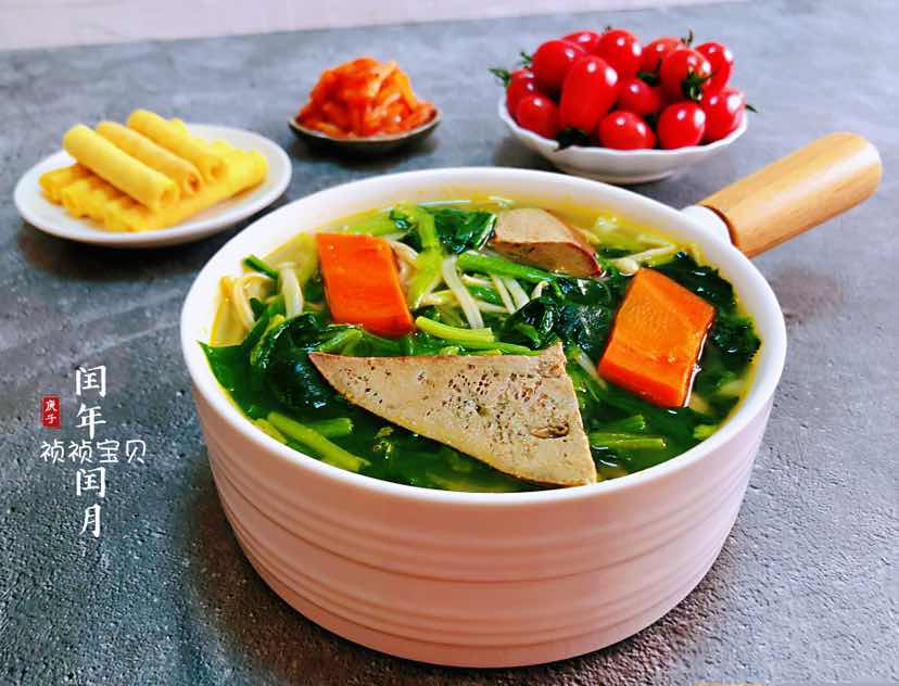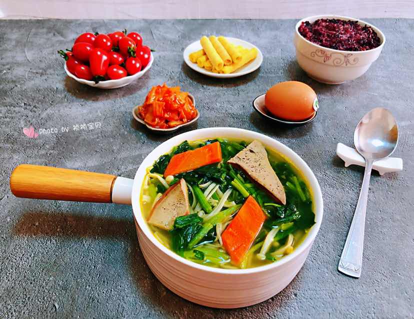 努力的提高自己 眼前的好好珍惜 过去的坦然接受 没来的颀然面对 今日早餐:猪肝菠菜时蔬汤+黑米饭+鸡蛋+辣白菜+水果+蛋酥卷