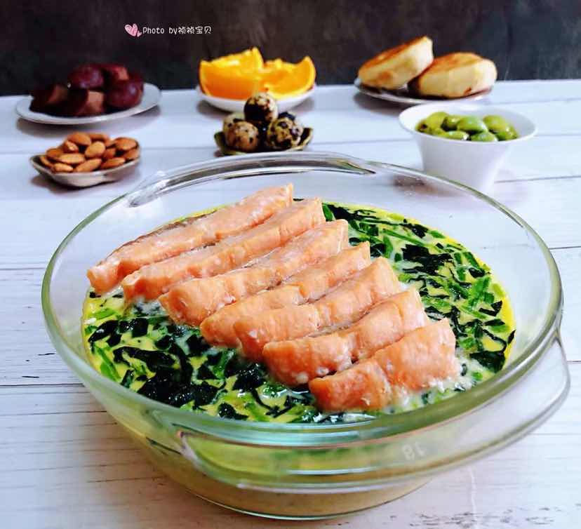 当笑容爬上你的脸庞,连太阳也会妒忌你的光芒。新的一周,记得给自己一个微笑。 今日早餐:三文鱼蒸菠菜鸡蛋羹+馅饼+鹌鹑蛋+橙子+血肠+坚果+腊八蒜