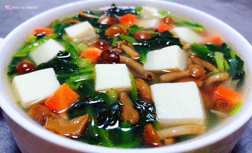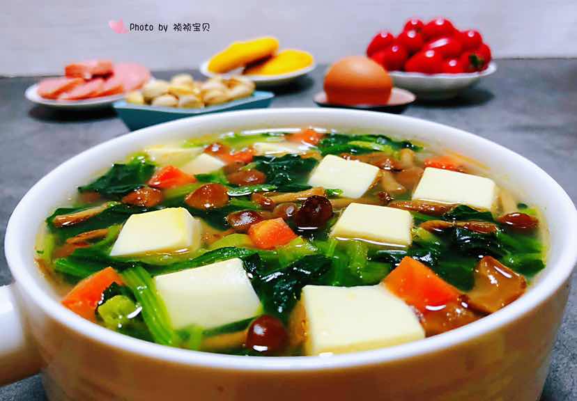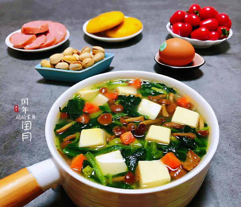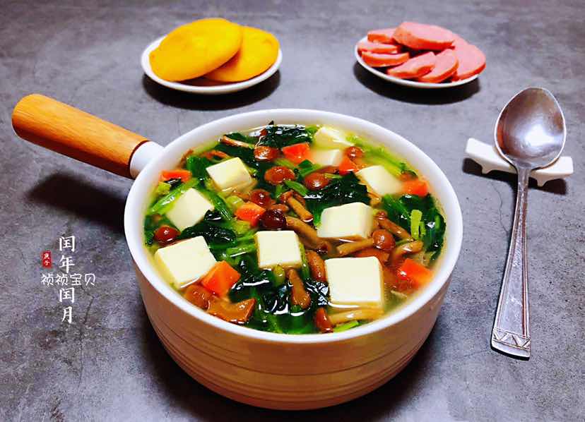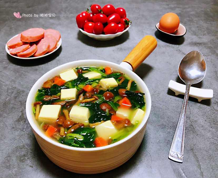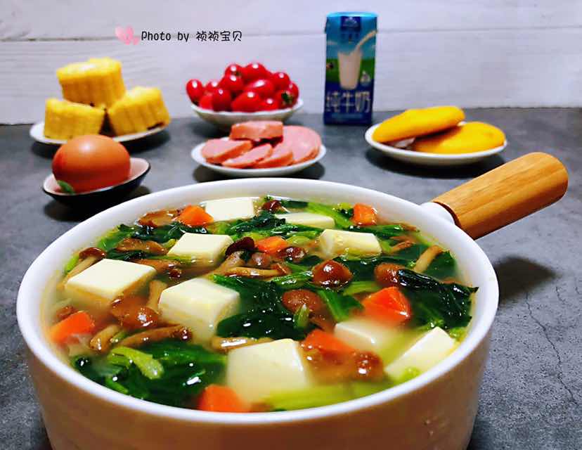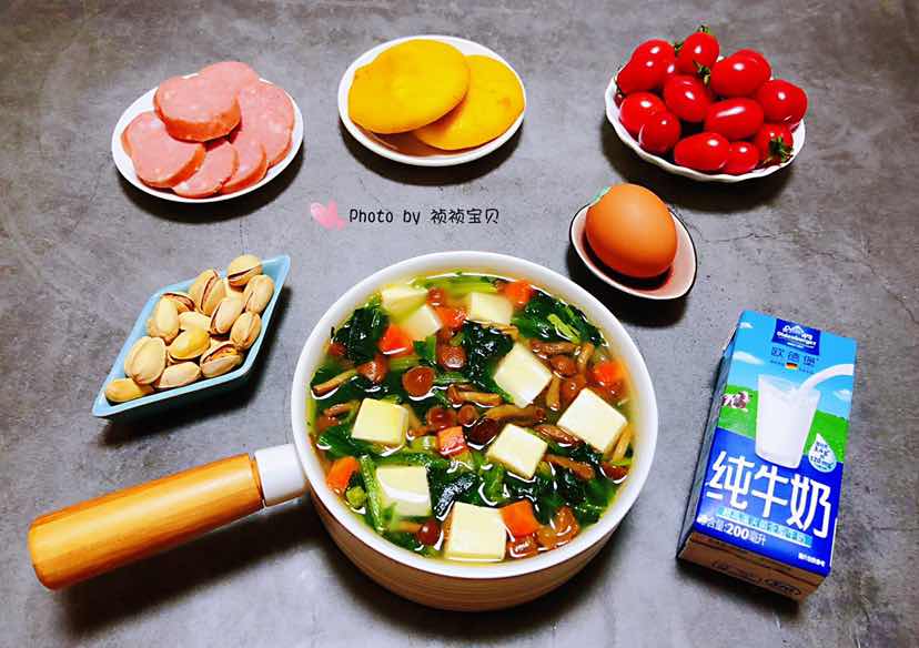 好的东西都值得花时间, 所有无论你现在多辛苦也别放弃, 想想已经坚持了多久才到这里。 滑子蘑菠菜豆腐羹+香肠+玉米+鸡蛋+玉米饼+牛奶+坚果+水果