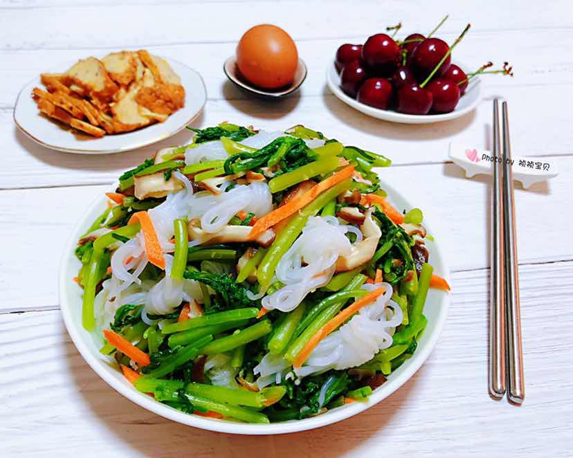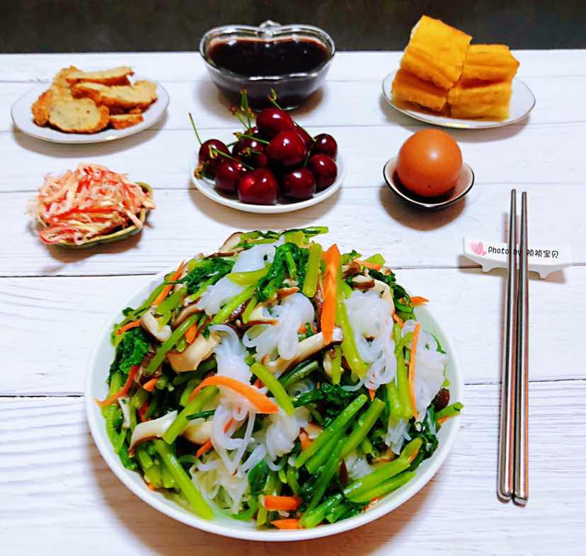 若不抽出时间来创造自己想要的生活,你最终将不得不花费大量的时间来应付自己不想要的生活!新的一天加油鸭 今日早餐:蒜泥茼蒿拌魔芋香菇胡萝卜+松子肉参+油条+黑米粥+鸡蛋+鱿鱼丝+樱桃