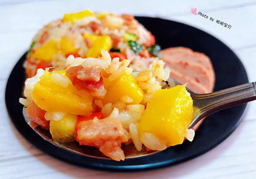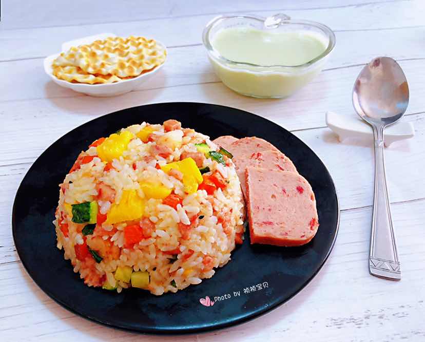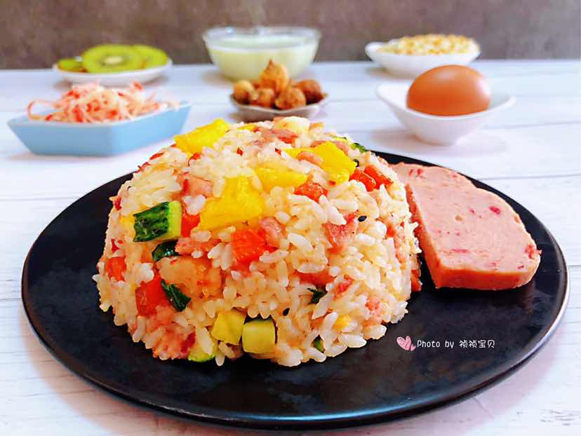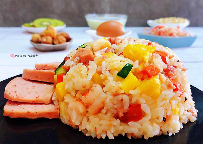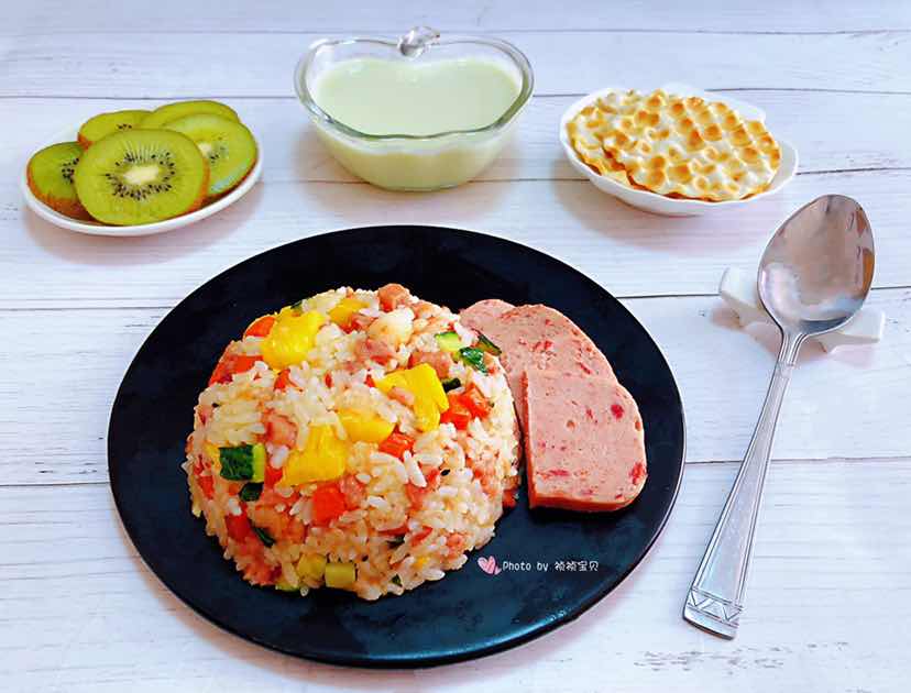 若以人情世故~ 来形容食材的相逢 有的叫动容邂逅相遇 有的叫相见恨晚 有的叫天作之合…… 今日早餐:菠萝虾仁午餐肉炒饭+豆浆+鸡蛋+脆煎饼+无花果+鱿鱼丝+猕猴桃