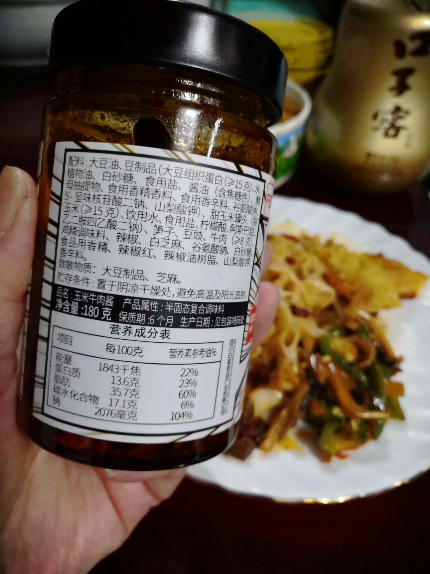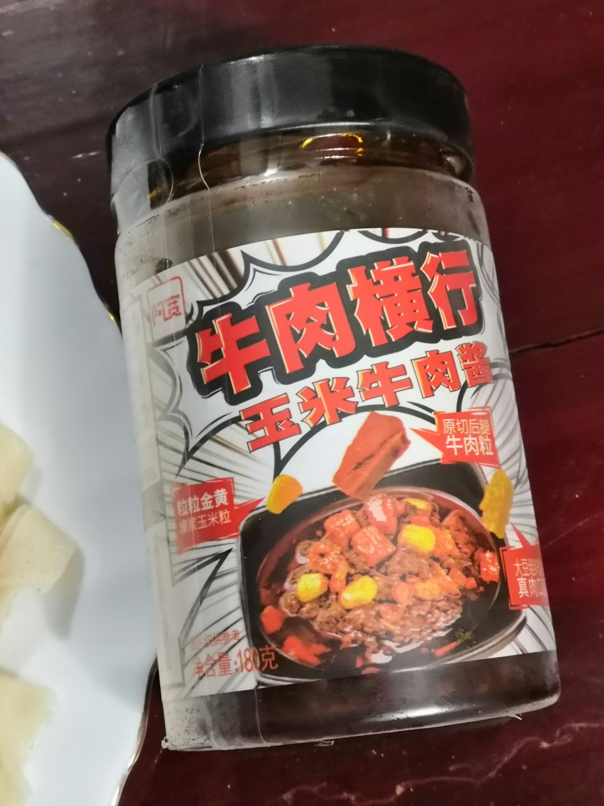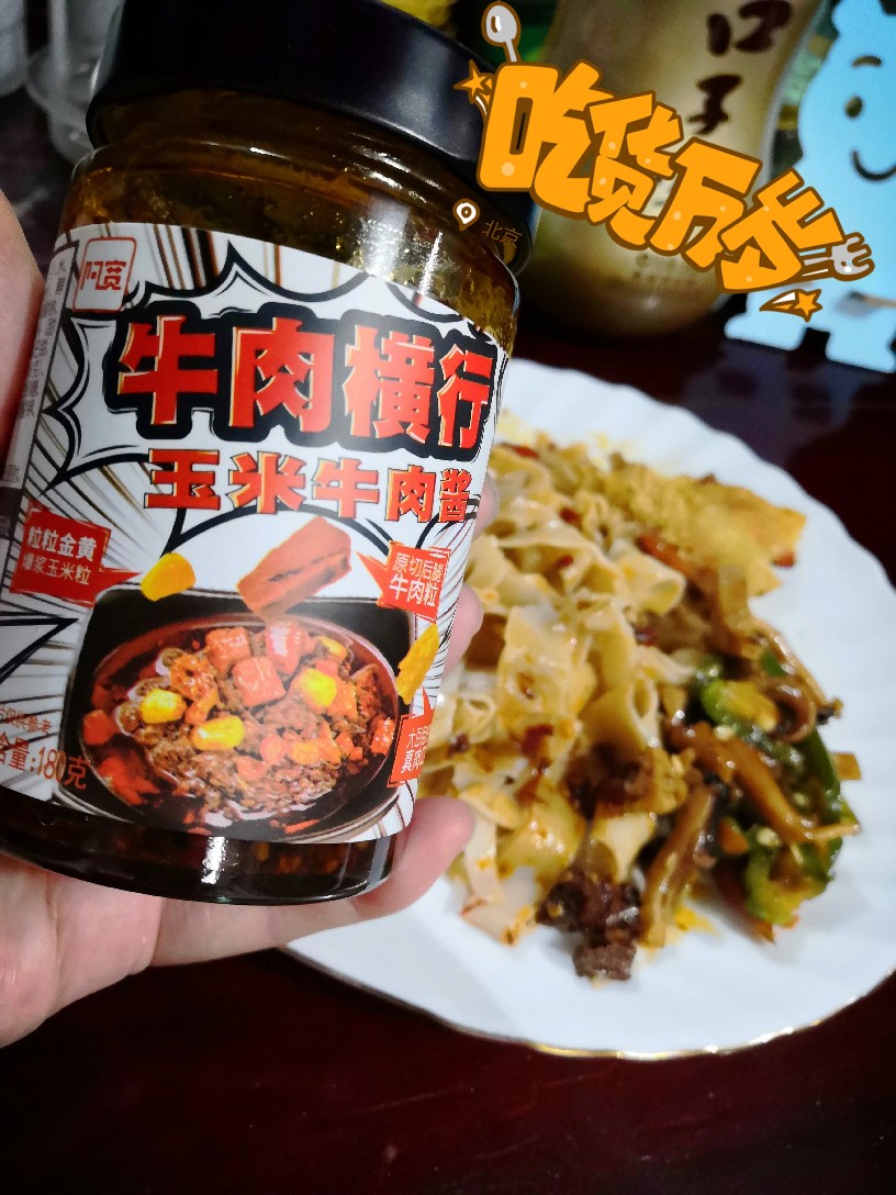 阿宽新出的玉米牛肉酱,开瓶即食,牛肉酱偏辣,有牛肉粒和玉米。周末,荞面加高筋粉,做了手擀面。锅中水开放入面,面熟捞出放入盘中,加上阿宽牛肉酱,一拌,再加上现炒的鱿鱼炒辣椒,不用另外加麻油,直接开吃。 牛肉酱,还适合炒菜、寿司、披萨……发挥自己的想象,过一个简单而快乐的周末!