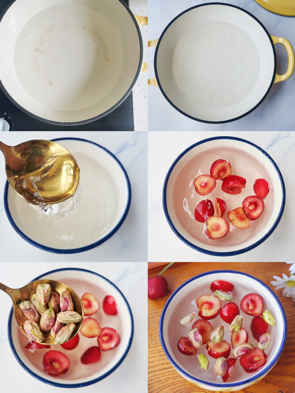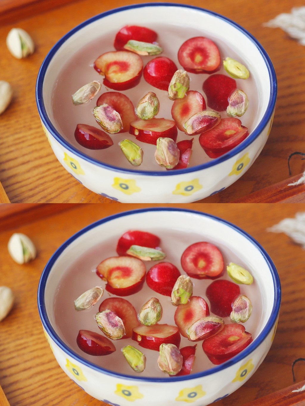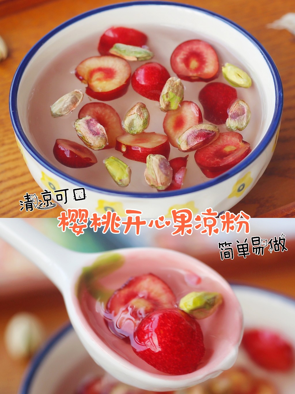 樱桃成熟的季节,来做一份清凉可口的樱桃坚果凉粉吧,来点开心果调味,喝一碗整天都开心了~
