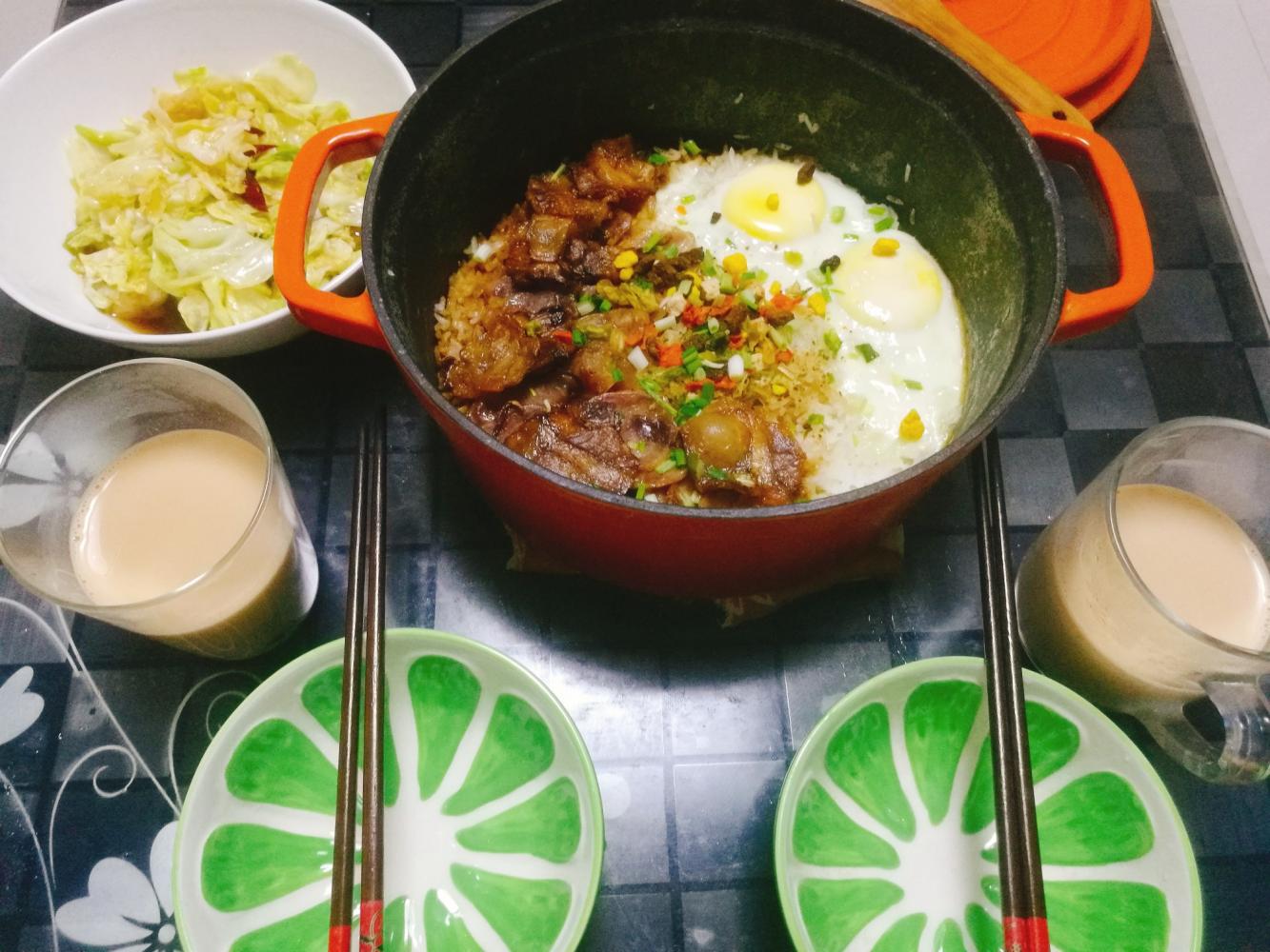 晚上得懒癌不想炒菜,做煲仔饭省力省时,配奶茶好好吃!