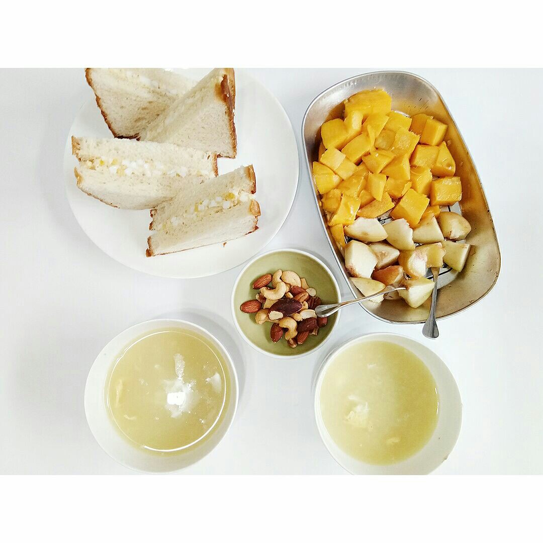 鸡蛋三明治,水果,坚果,小麦胚芽大米粥