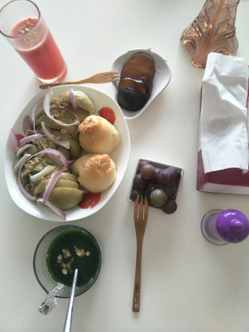 前天烤的抺茶软欧包和蜂蜜小面包!配上果蔬汁!还能将就吧?