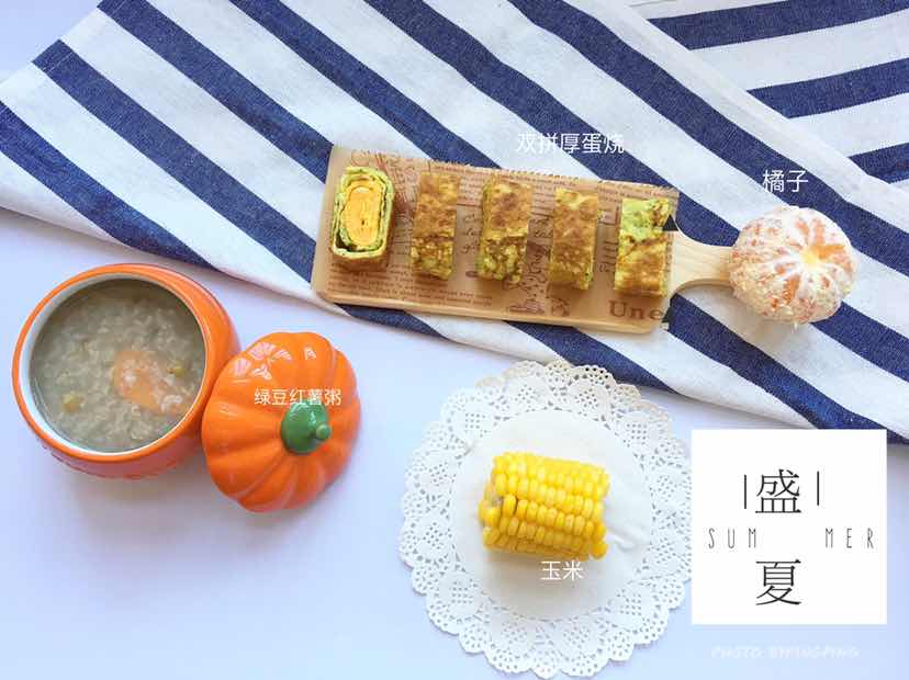 绿豆红薯粥 双拼厚蛋烧 玉米 橘子