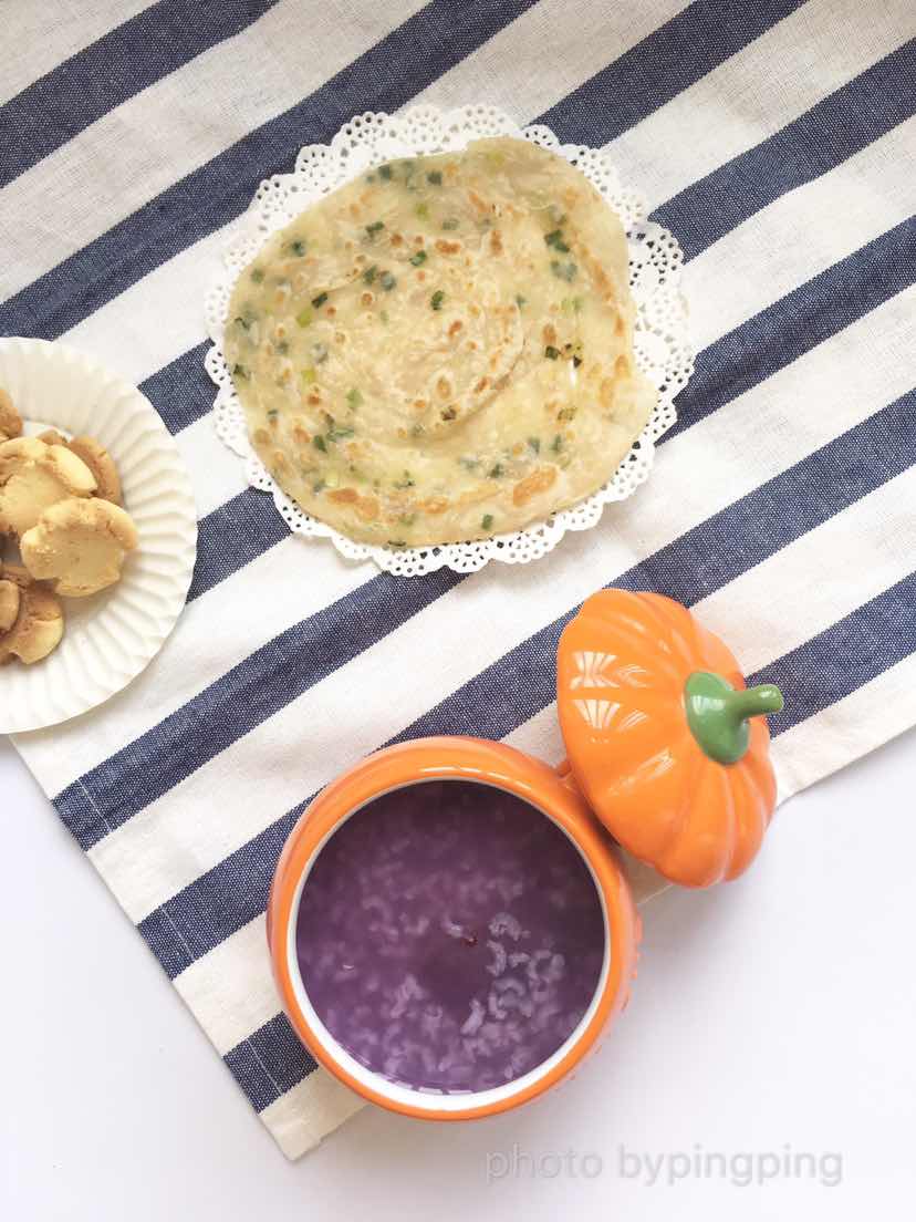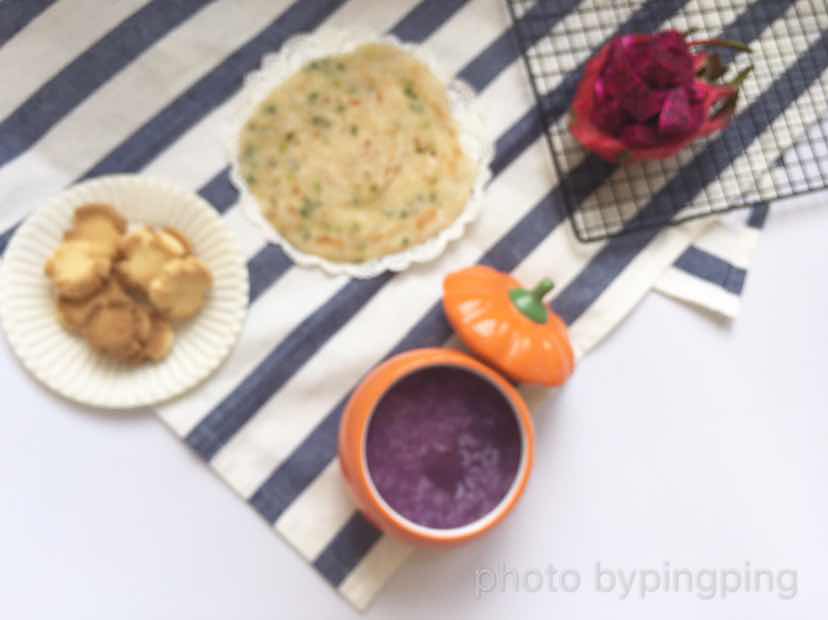 紫薯黎麦粥 干贝炖蛋 葱油饼 火龙果 玛格丽特饼干