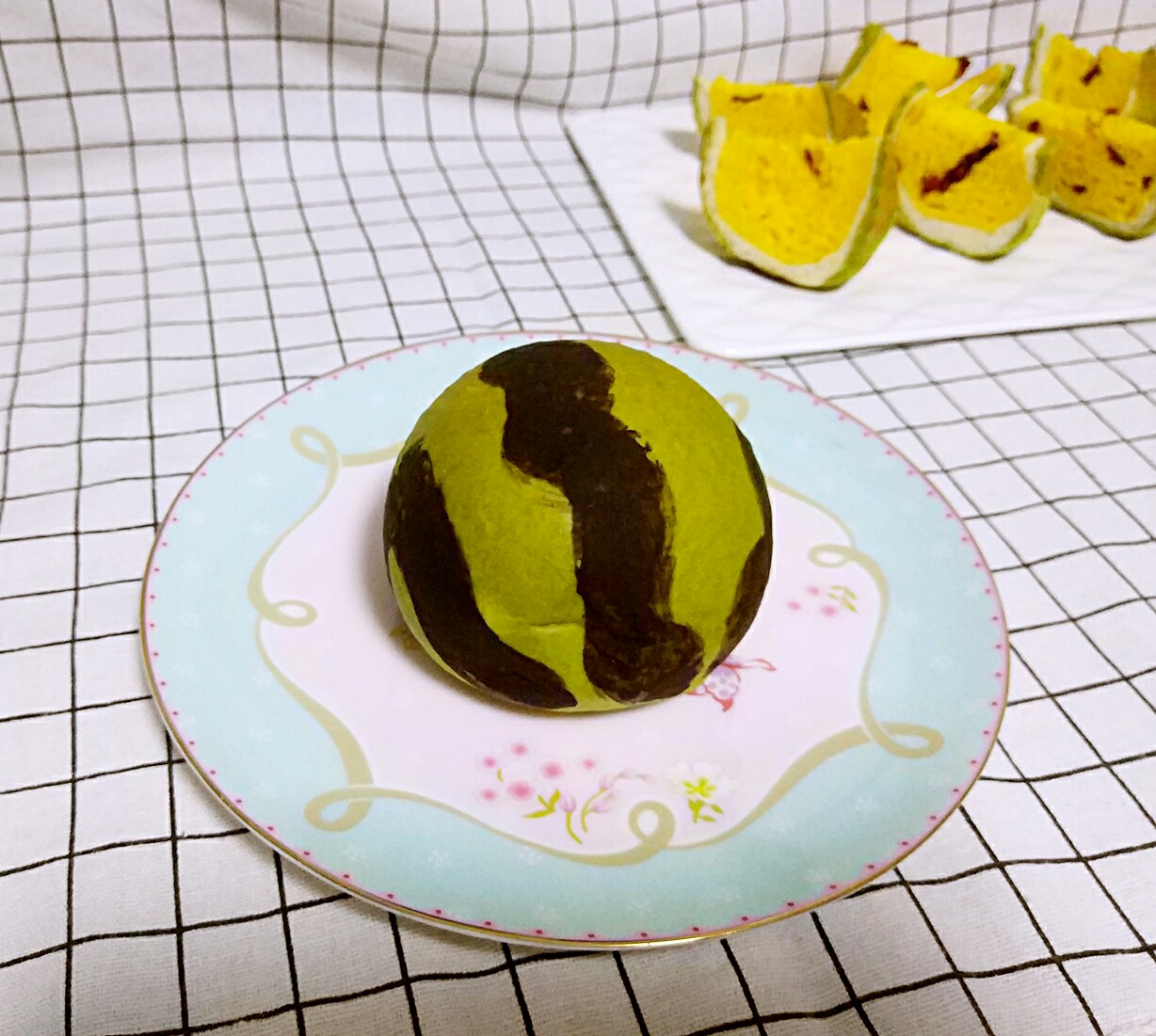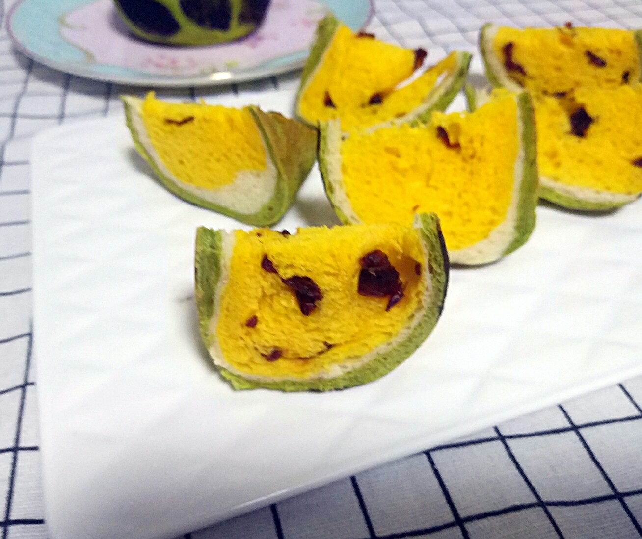 蔓越莓放的有些多了。表面画的也不好,今晚就当先练手了。下周在做。 按原方子比例做了调整面粉减到200克,做了三个小西瓜出来。