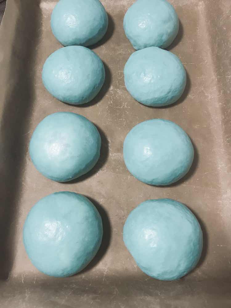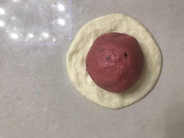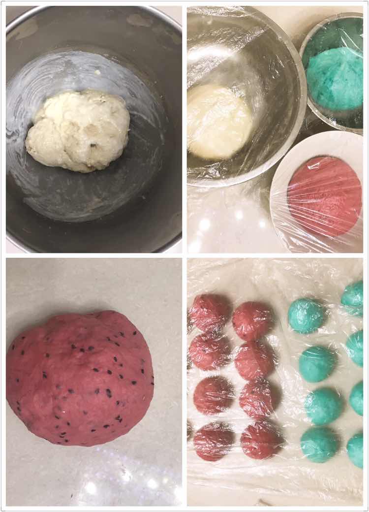 西瓜面包 炎热的夏天,你吃过西瓜,你吃过烤箱里做出来的西瓜吗?一样漂亮,一样美味。 配方: 高筋面粉 375 克 牛奶。 225 克 全蛋液。 20 克 盐。 3 克 酵母。 4 克 白砂糖。 40 克 玉米油。 25 克 馅料:黑芝麻少许 色料: 红曲粉。 2 克 食用色素西瓜绿 少许 制作: 1: 把配方里所有食材除酵母外,全部放入厨师机桶里,揉成面团放入冰箱冷冻15 分钟。(这样可