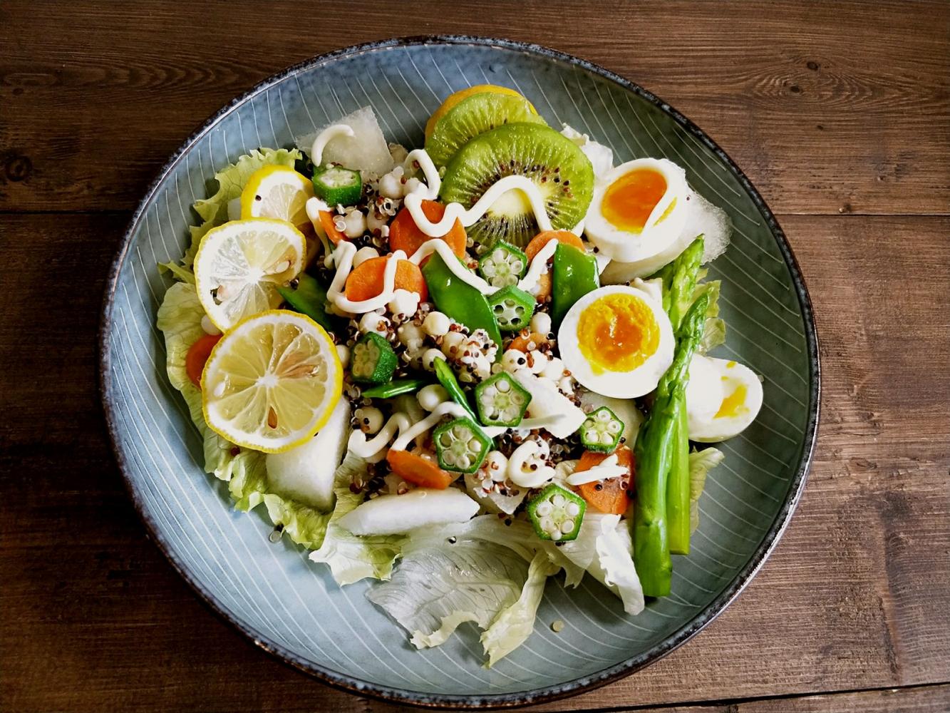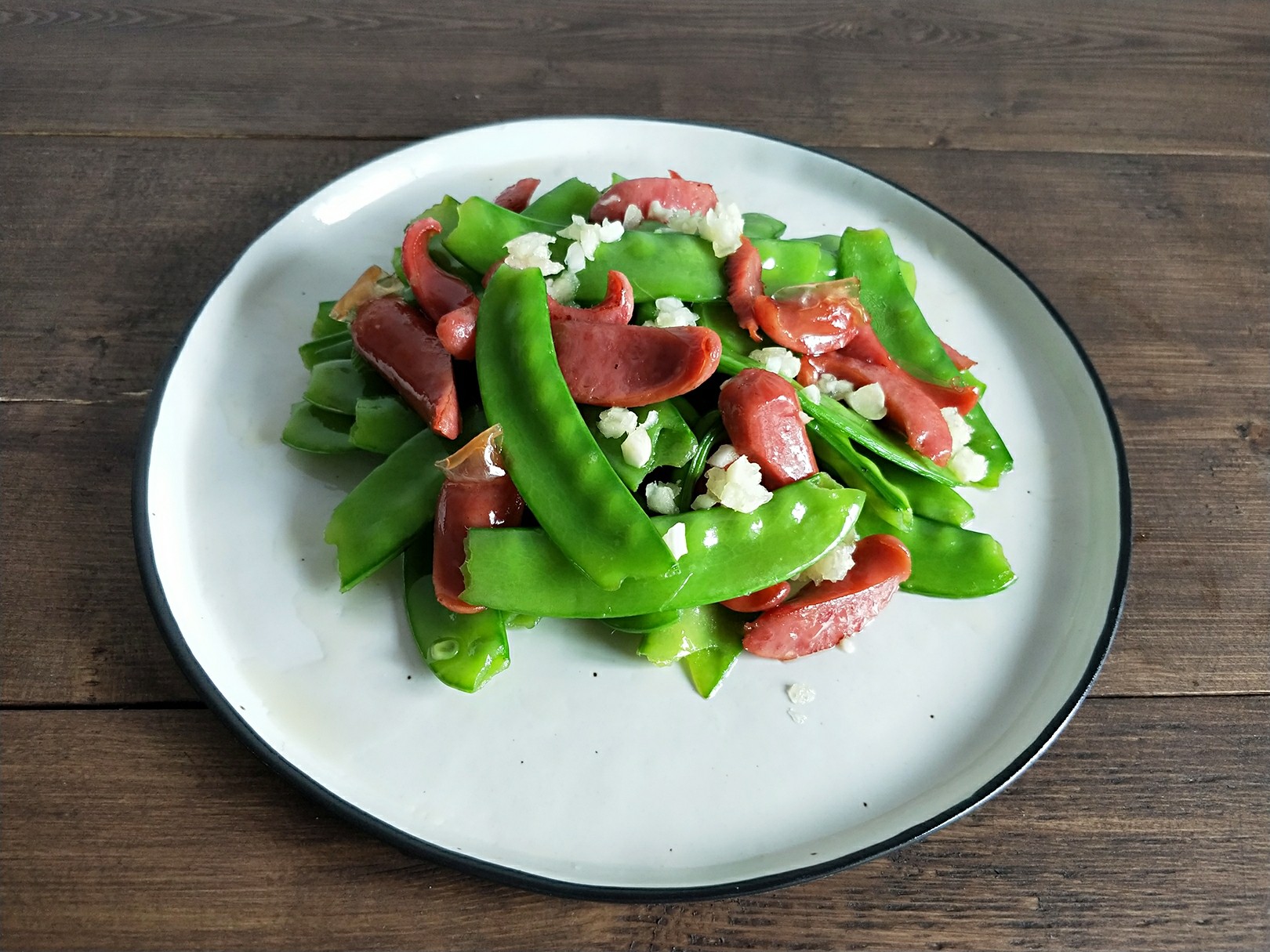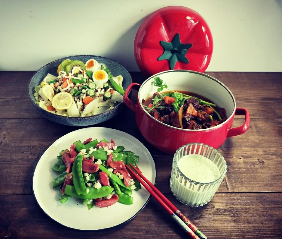 番茄炖牛腩,荷兰豆炒香肠,藜麦色拉,牛油果奶昔