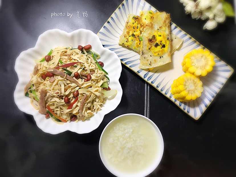 烫卜页、鸡蛋饼、玉米、粥