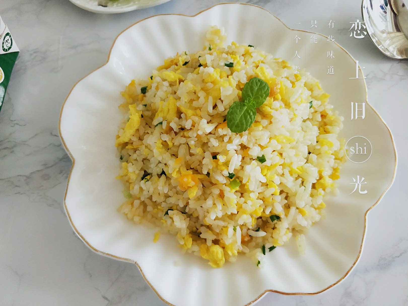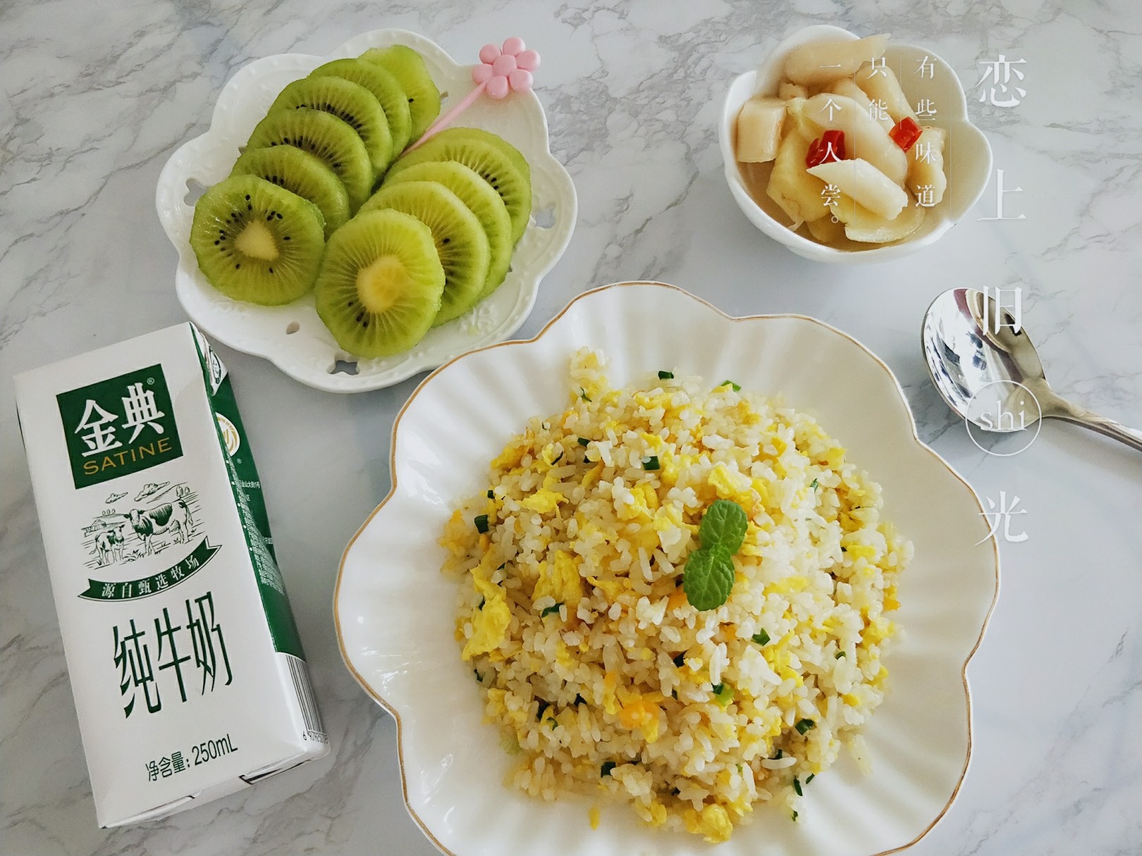 蛋炒饭,水果,仔姜,牛奶