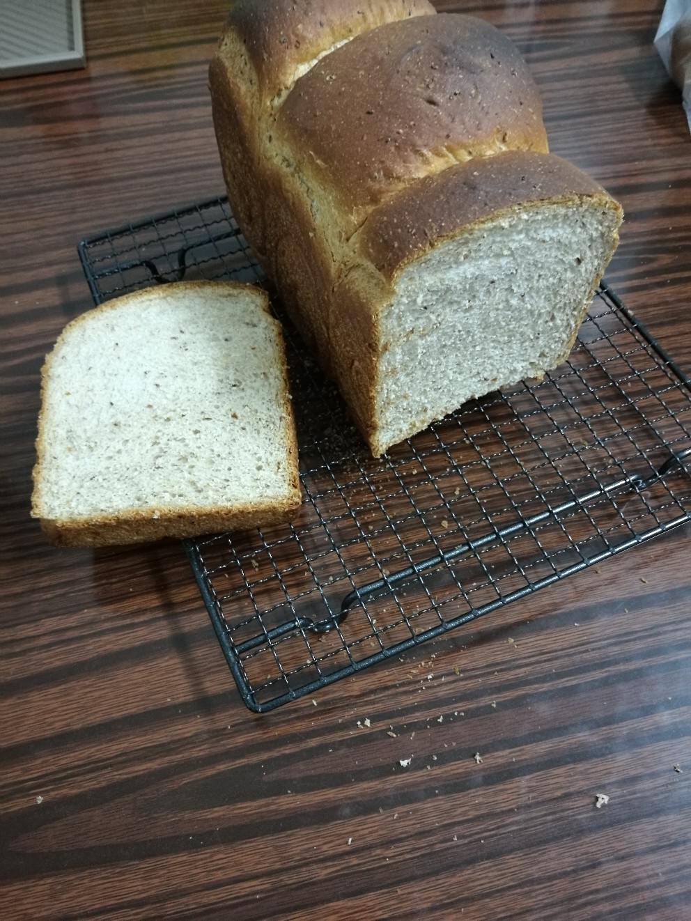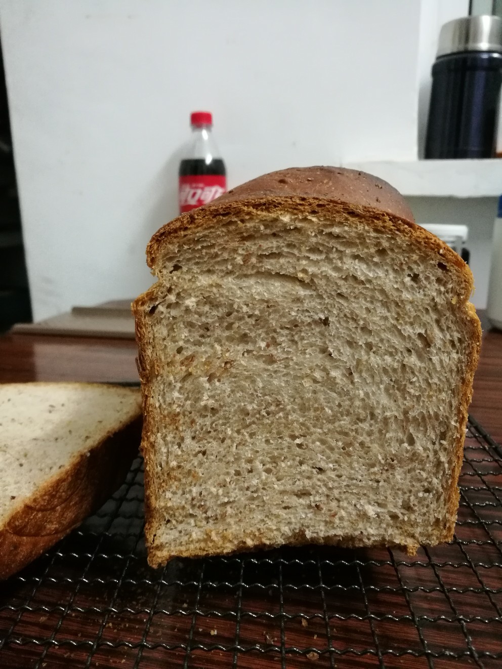 全麦的筋度不够,一般都是加20%的全麦粉 这个100%全麦不错了,下次烤山形的前十分钟不要走开,看上色情况,差不多了就加要加锡纸了,加了锡纸再走开就没事了