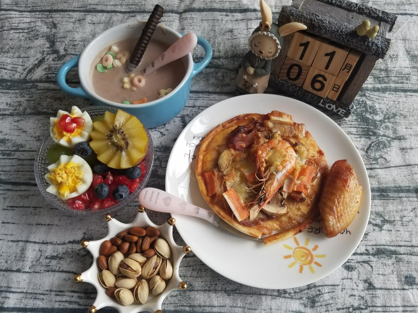 披萨鸡翅+五谷杂粮+水果拼