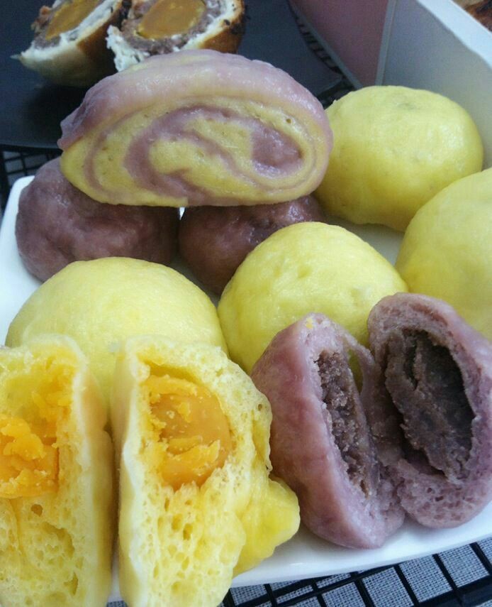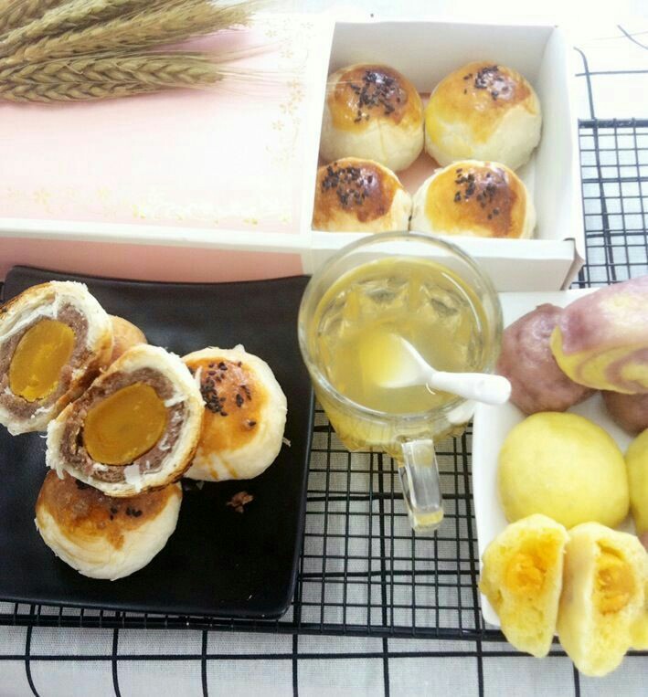绿豆红豆馅的蛋黄酥,酥的掉一地渣渣 柚子茶配上南瓜紫薯馒头