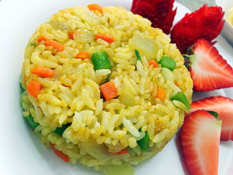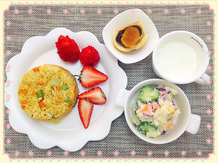 #早餐# 咖喱炒饭、土豆泥蔬菜沙拉、牛奶、蛋黄酥、草莓#365天,早餐不重样# [爱心]MM今早说我草莓切的不漂亮[可怜][可怜]