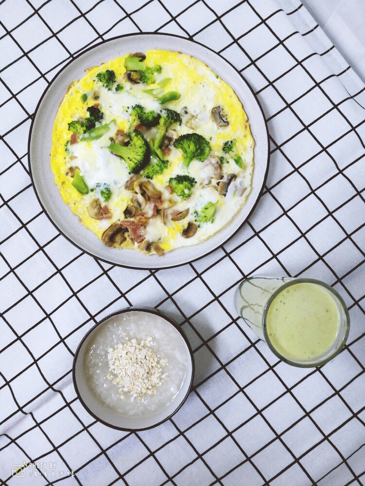 今日小学生早餐:燕麦大米粥,火腿蔬菜芝士烘蛋,香蕉牛油果奶昔。