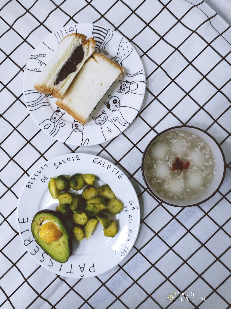 今日小学生早餐:酒酿黑芝麻汤圆,紫米奶酪包,烤孢子甘蓝,牛油果焗蛋。