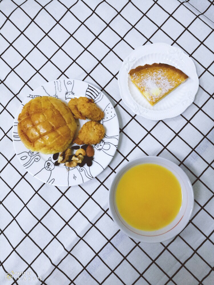 今日小学生早餐:南瓜小米粥,菠萝包,椰香南瓜派,烤鳕鱼块,每日坚果。