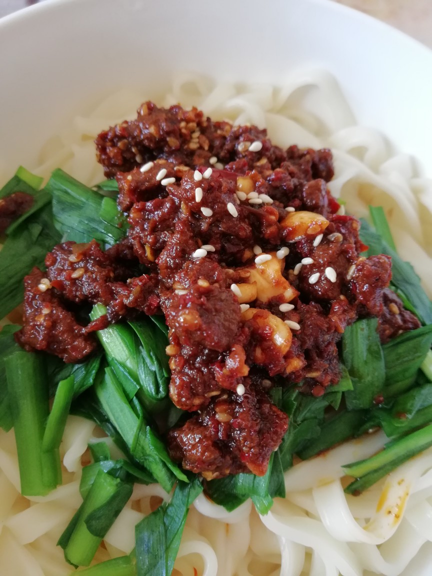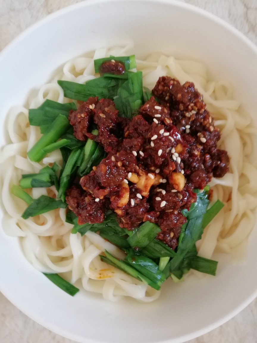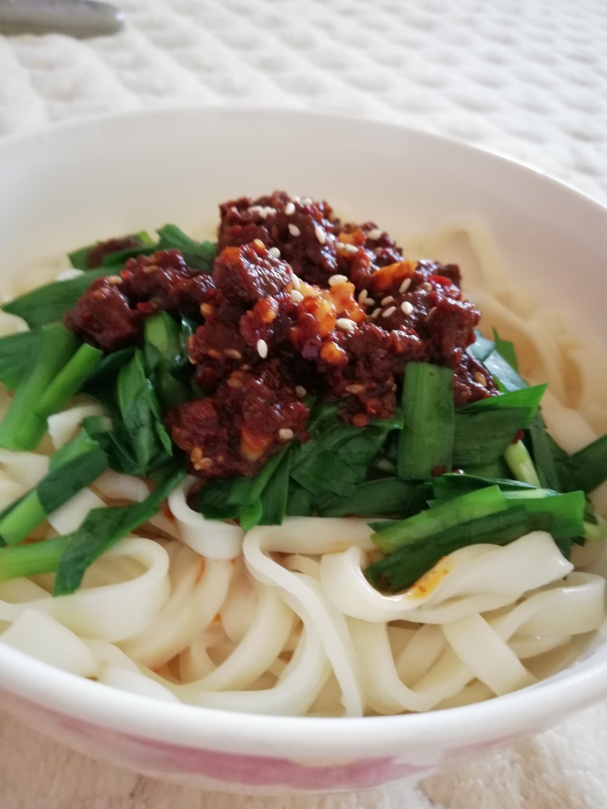 面条、牛肉酱、韭菜、