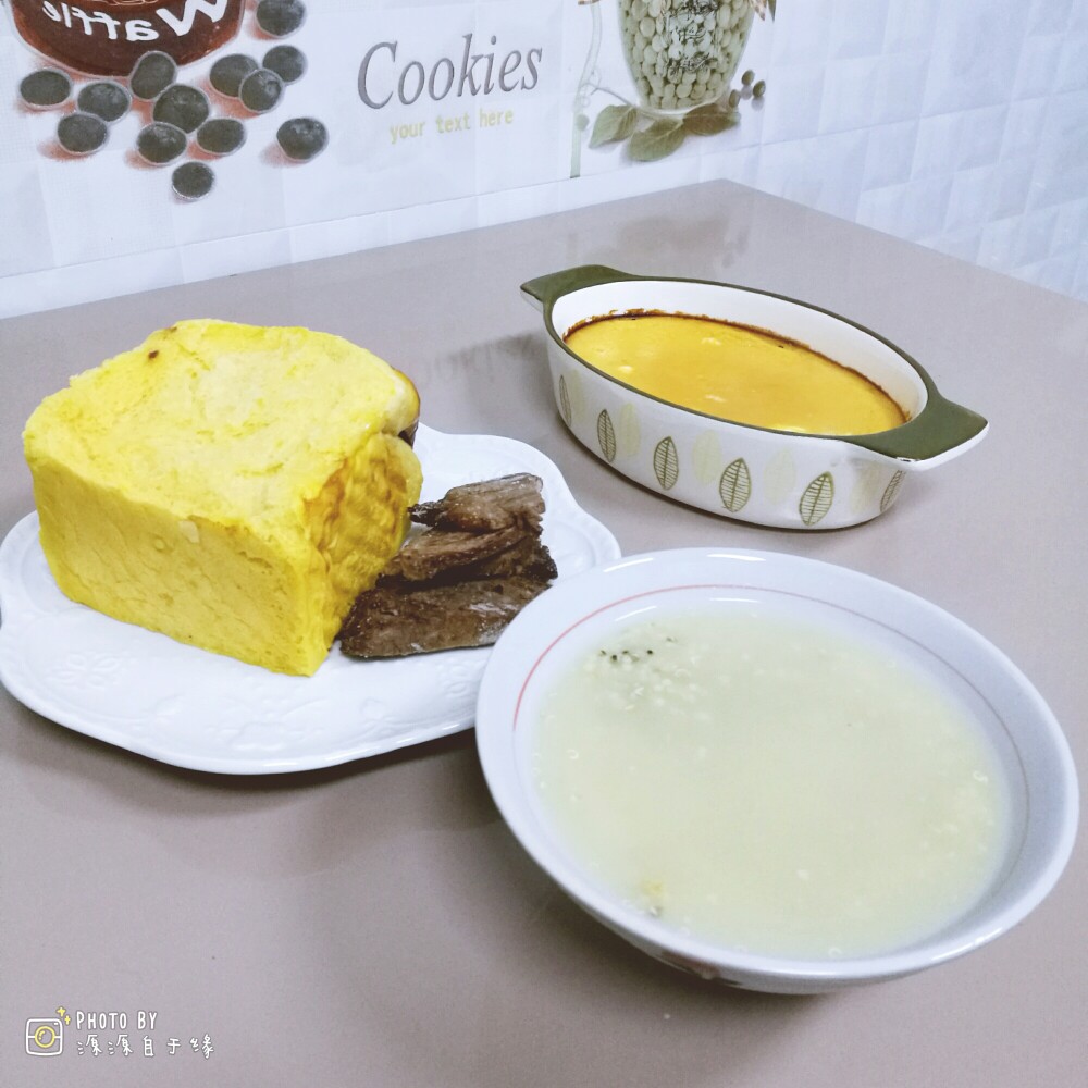 今日小学生早餐:三色藜麦小米粥,南瓜豆沙吐司,南瓜鸡蛋布丁,卤牛肉。