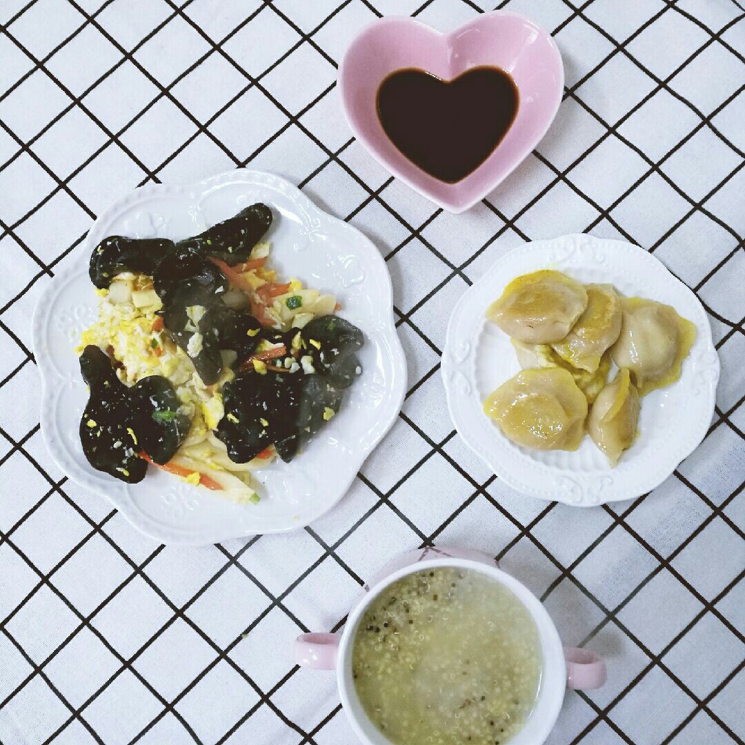今日小学生早餐:三色藜麦小米粥,煎荠菜水饺,木耳山药炒鸡蛋。