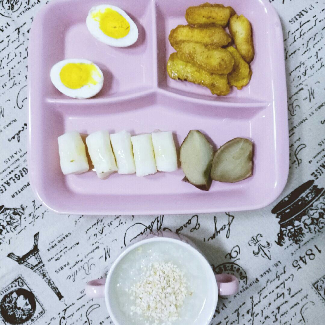今日小学生早餐:燕麦粥,蜂蜜山药,红薯,椒盐龙利鱼,水煮蛋。