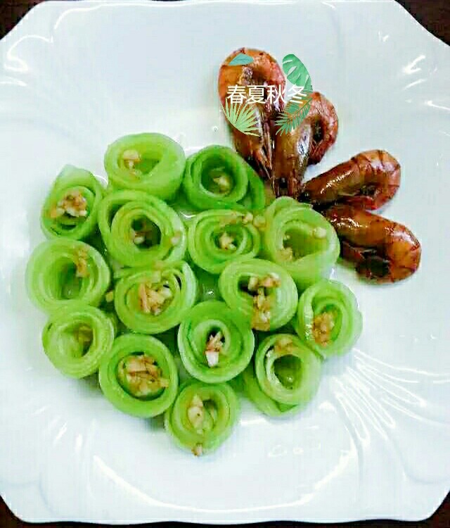 黄瓜去皮,刨成薄片,加盐,糖,醋腌制一会,卷起,码放在盘中,撒上蒜泥,放上几只糖醋虾。