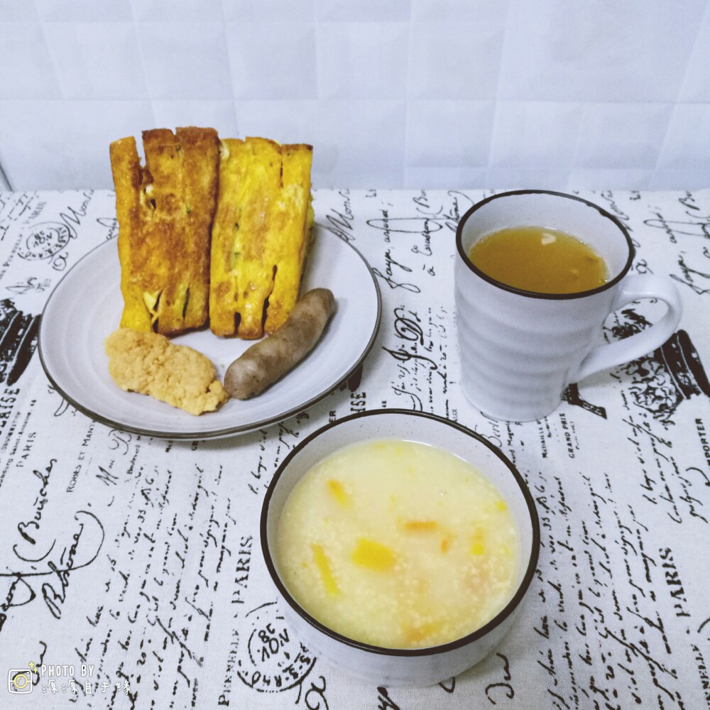 今日小学生早餐:南瓜小米粥,南瓜吐司三明治,自制脆皮肠,烤鳕鱼块,百香果蜂蜜水。