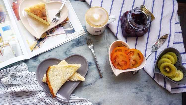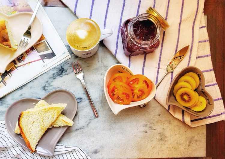 有自己烤制的牛奶吐司,还有舒芙蕾芝士蛋糕,外加自己熬制的颗粒樱桃酱,咖啡必不可少。 无公害绿色番茄,黄心猕猴桃
