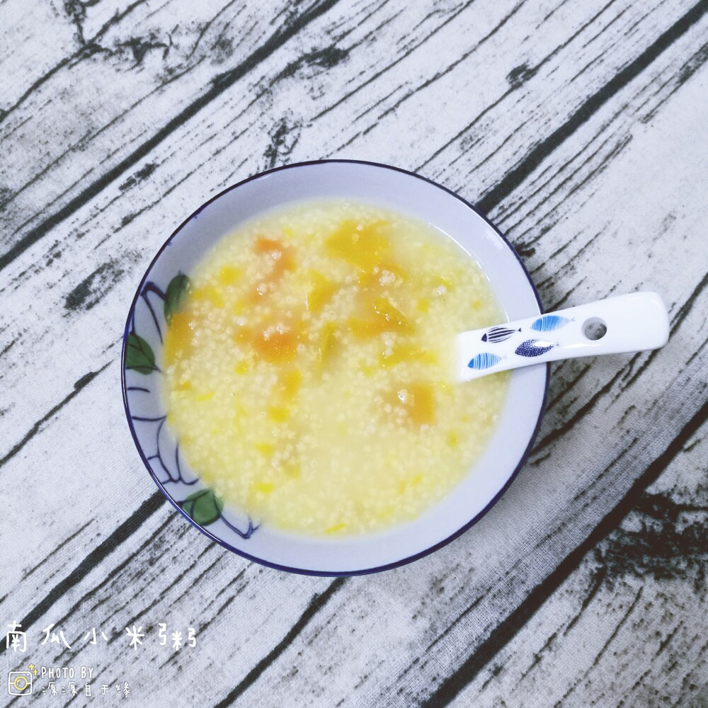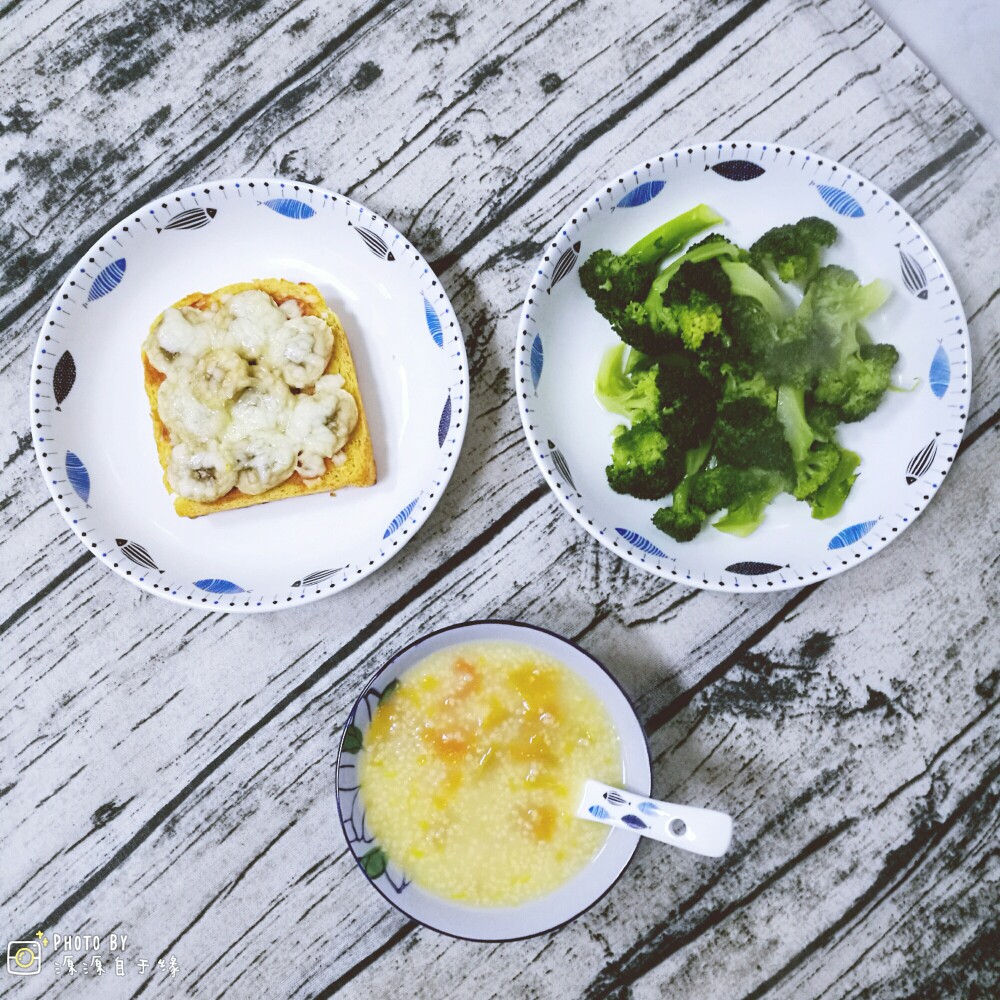 今日小学生早餐:南瓜小米粥,香蕉吐司披萨,白灼西兰花。
