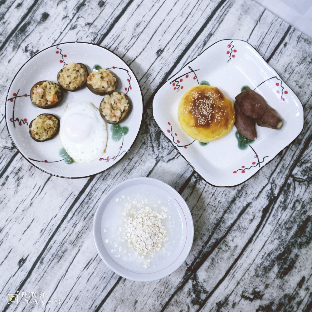 今日小学生早餐:燕麦粥,鲜虾香菇盏,煎鸡蛋,胡萝卜餐包,小香薯。